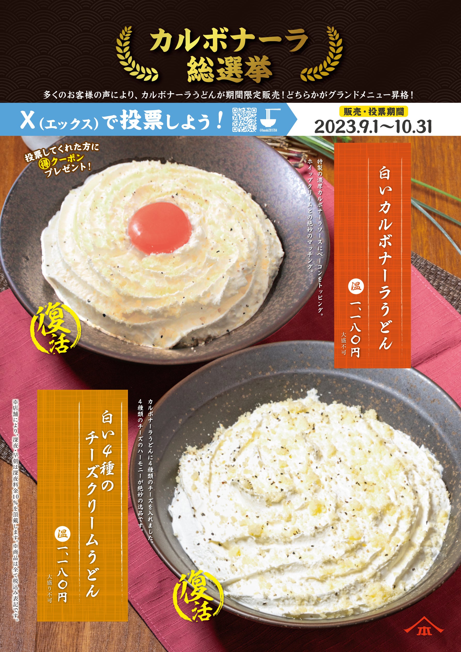 のチーズクリームうどん」どちらかのグランドメニュー昇格をかけた、「カルボナーラ総選挙」を開
