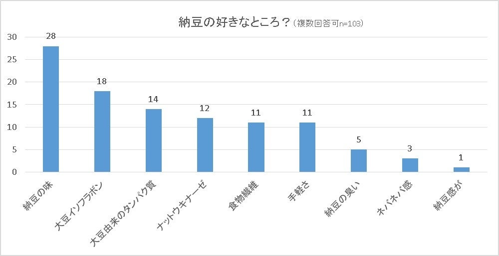 商品の開発にあたり、当社が、「納豆の好きなところは?」というアンケートを実施したところ、1位『味』、2位『大豆イソフラボン』、3位『納豆由来のタンパク質』、4位『ナットウキナーゼ』という結果となりました。<図1>※インターネット調査 日本人43人に実施(2023年7月)