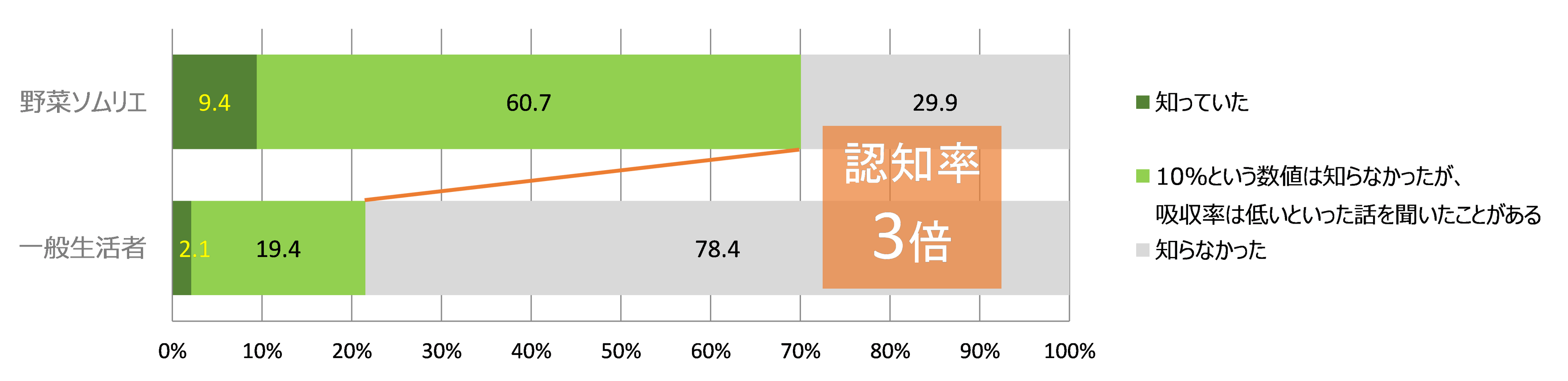 野菜ソムリエの70.1%は吸収率が低いことを認知しているものの、「吸収率10%」の事実に驚いた。