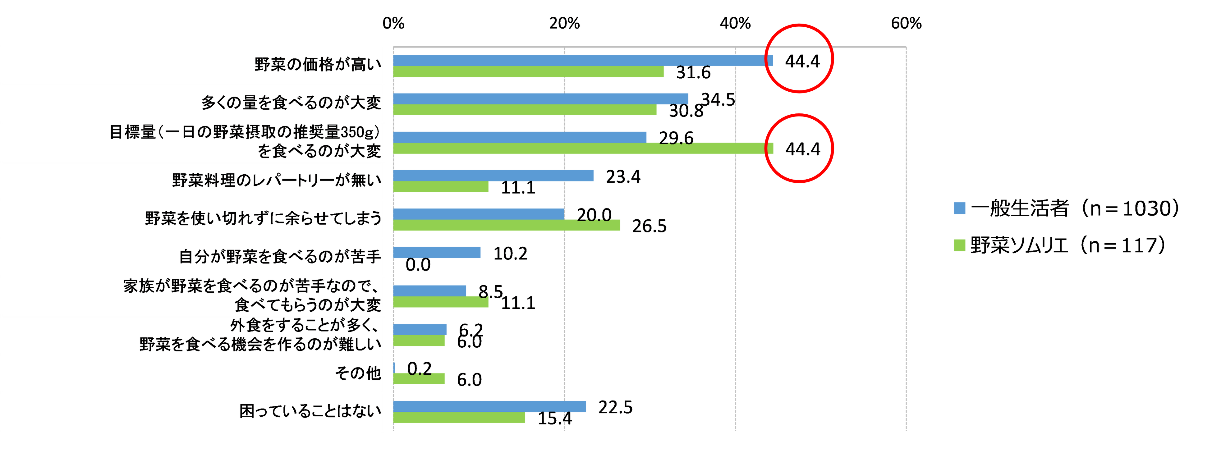 野菜ソムリエは「1日の摂取目標達成の難しさ」、一般生活者は「そもそも野菜高騰により価格が高いこと」という結果に。