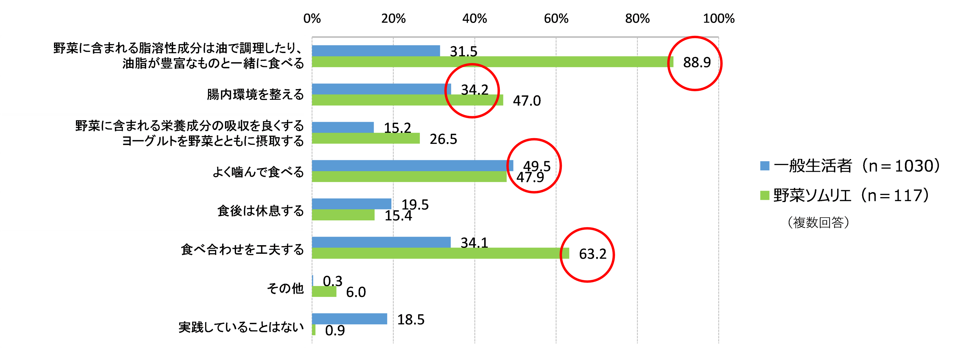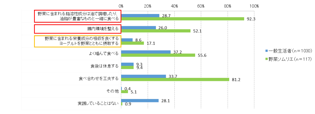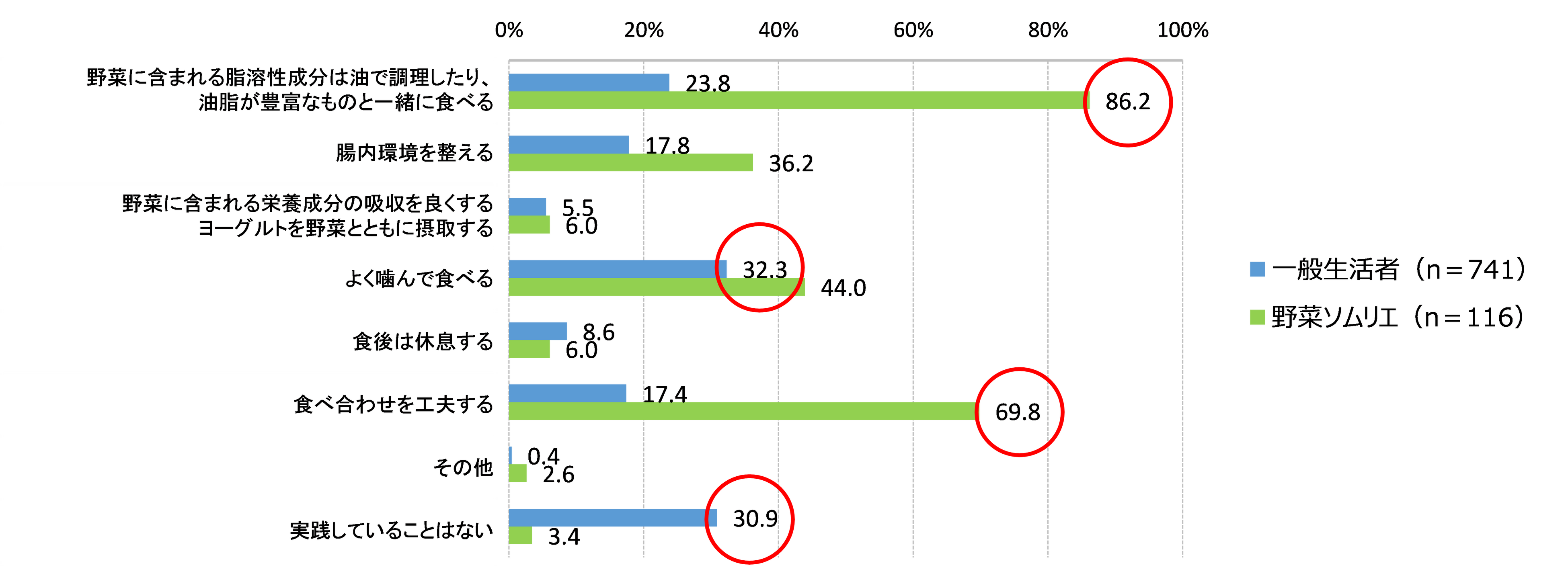 ⇒野菜ソムリエが「野菜に含まれる脂溶性成分は油で調理したり、油脂が豊富なものと一緒に食べる(86.2%)」や「食べ合わせを工夫する(69.8%)」と知識を活かし実践しているのに対し、一般生活者は「よく噛んで食べる(32.3%)」や「実践していることはない(30.9%)」が目立ち、野菜の栄養素の吸収率を高められていないことがわかりました。