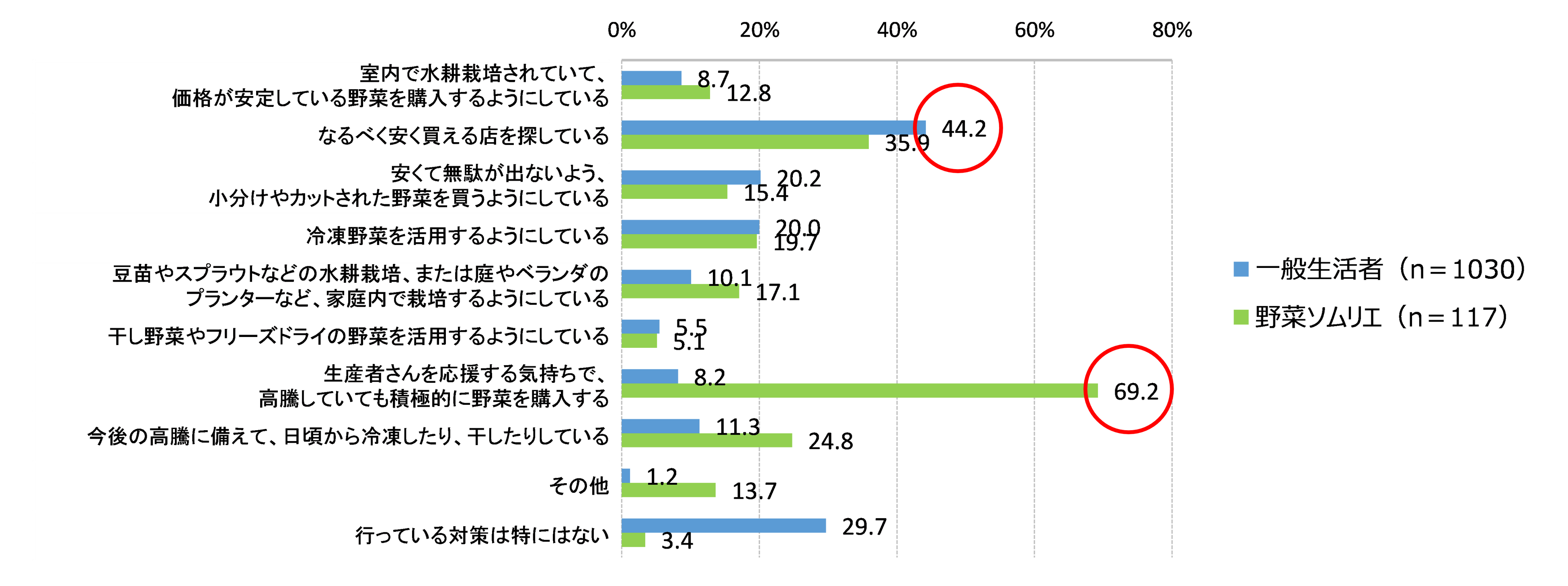 ⇒野菜ソムリエは、「生産者さんを応援する気持ちで、高騰していても積極的に野菜を購入する(68.6%)」と