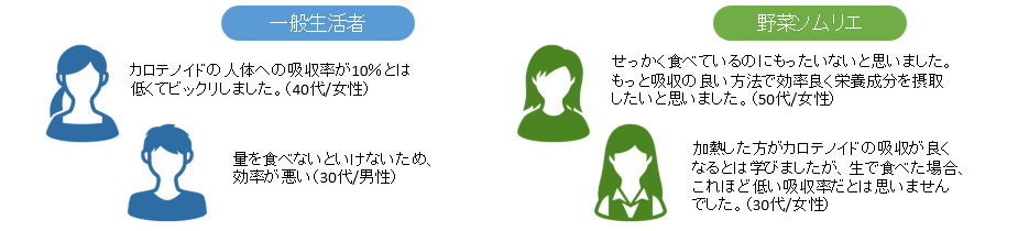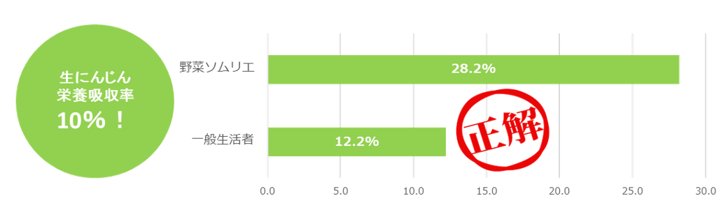 ⇒野菜ソムリエは「吸収率が低いことは認知していた」が、「10%」という数字には一般生活者・野菜ソムリエともに驚いた人が多くいました。