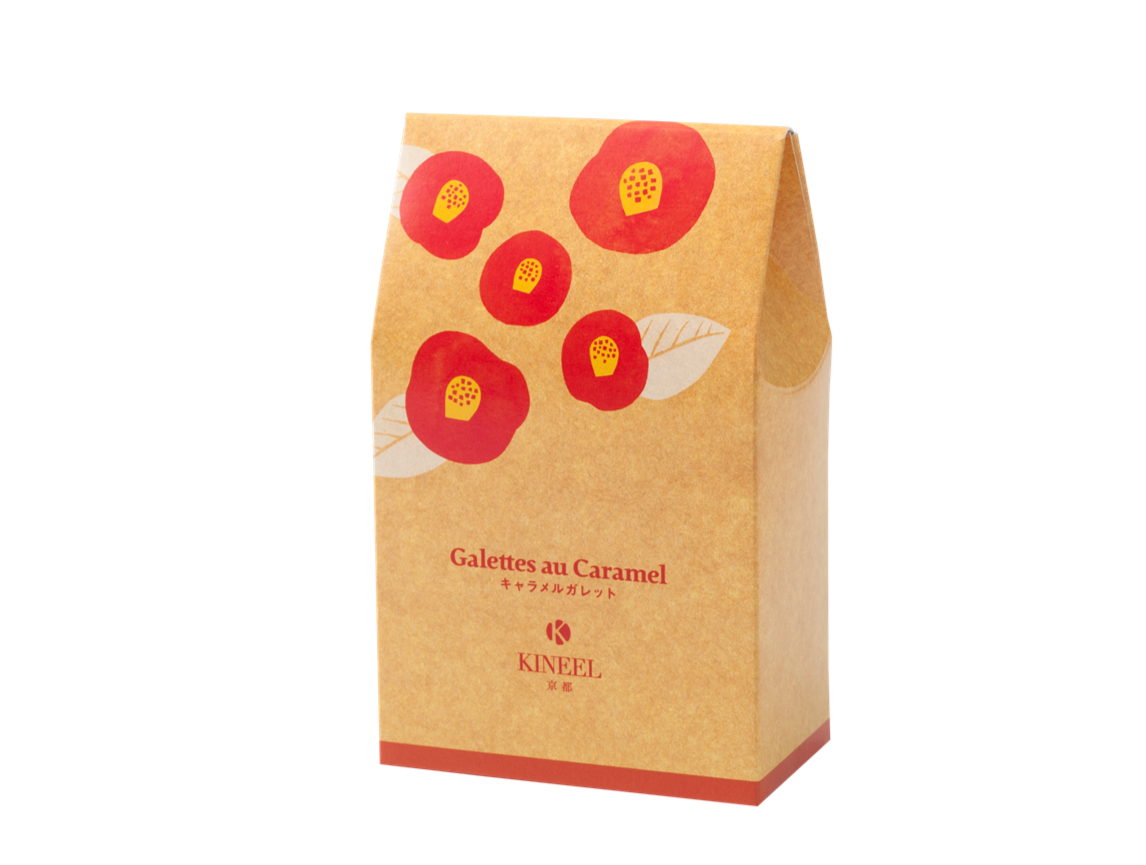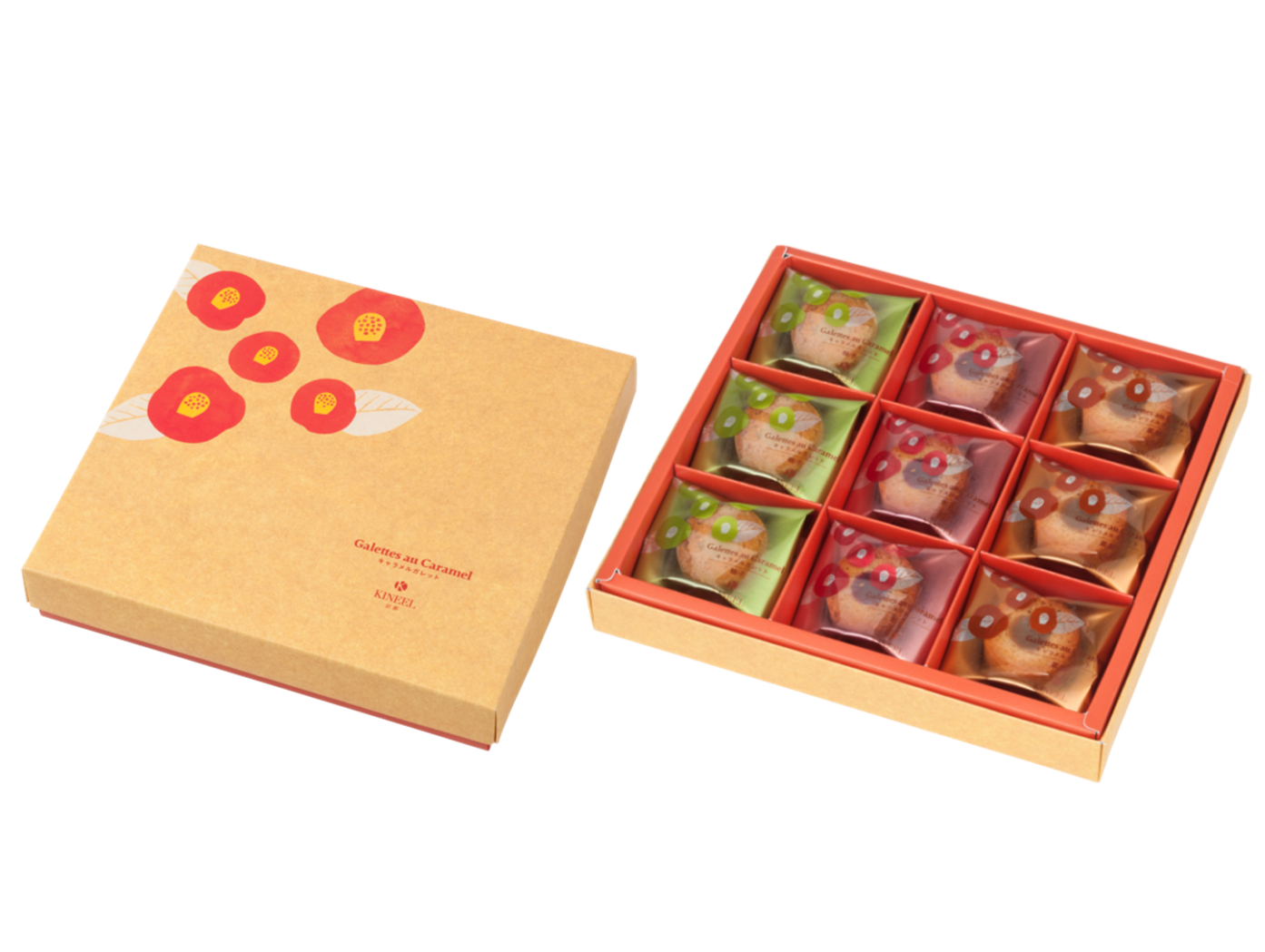 「京都スタイル」の上品さと四季の美をコンセプトに、「椿」の花言葉である「謙虚な美徳」や「誇り」をモチーフにしたデザインを採用し、パッケージには京都の上品さと落ち着いたイメージを表現したマット調に施しました。6個入りと9個入りのパッケージには菓名に赤の箔押しを施し、一層の上品さを演出しています。また、個包装はメタルカラー調に仕立て、キャラメルの濃厚さと各種の素材の風味を感じることができる上質なデザインで仕立て、自分へのご褒美だけでなく贈り物としても最適な、「とっておきの秘密のお気に入り」としてご利用いただけます。
