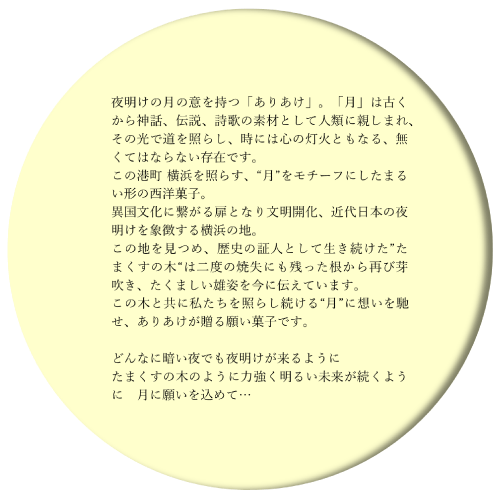 “キャラメル”の歴史をひもとくと、古くは1000年以上前のギリシャにまでたどり着くともいわれています。日本文化と西洋文化が奏でてきたこの“キャラメル”の味わいは、異国の文化に繋がる扉となり、近代日本の夜明けを象徴するこの横浜の地で皆様に育てていただいた弊社の記念すべき周年企画のお菓子としてぴったりの素材であることから、新たに開発するにいたりました。キャラメルの香りたかい、風味豊かなもっちり食感をお楽しみください。