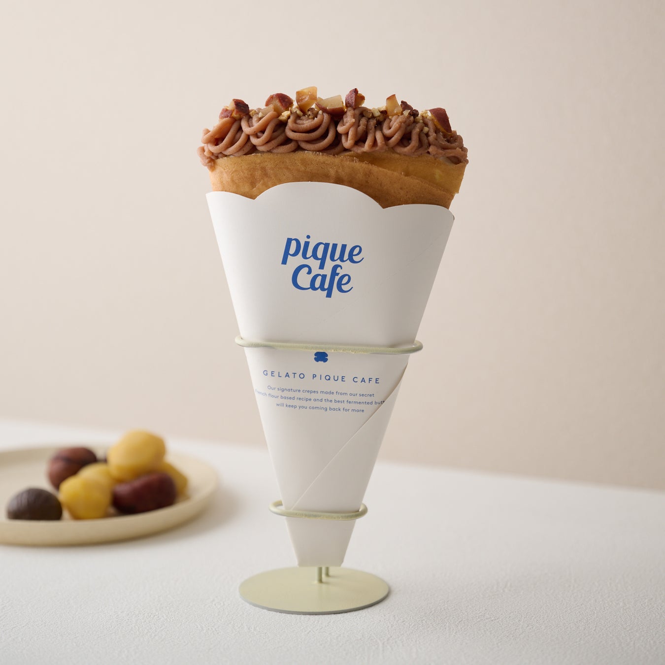 gelato pique cafeの人気商品「バターとお砂糖のクレープ」に、モンブランクリームとパイ生地を重ねた秋限定ホットクレープ。