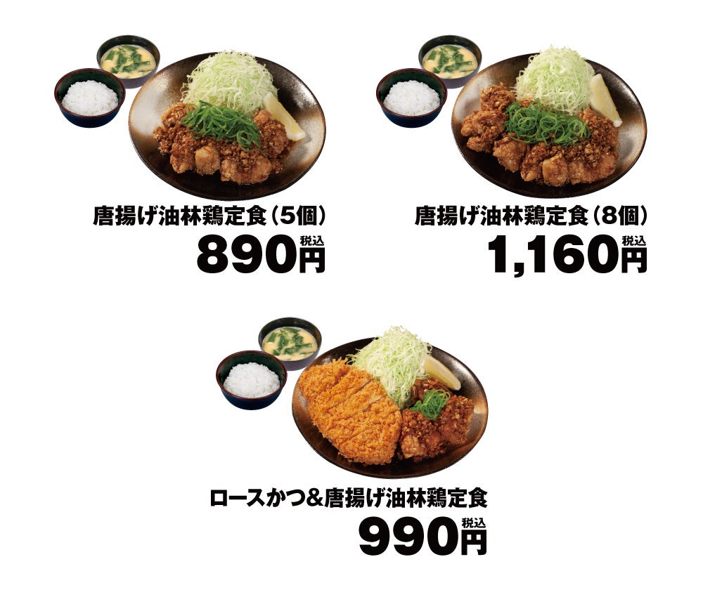 商品名 唐揚げ油淋鶏定食(5個) 890円 唐揚げ油淋鶏定食(8個) 1,160円 ロースかつ&唐揚げ油淋鶏定食(3個) 990円 ※お持ち帰りいただけます。お持ち帰りのみそ汁は、別途60円でお買い求めいただけます。 ※全て税込価格です。また、店内・お持ち帰りの税込価格は同一です。 ※株主優待券は上記全てのメニューにご使用いただけます。(単品は除きます。) ※「唐揚げ油淋鶏」販売期間中、「本格唐揚げ」関連商品は休止します。