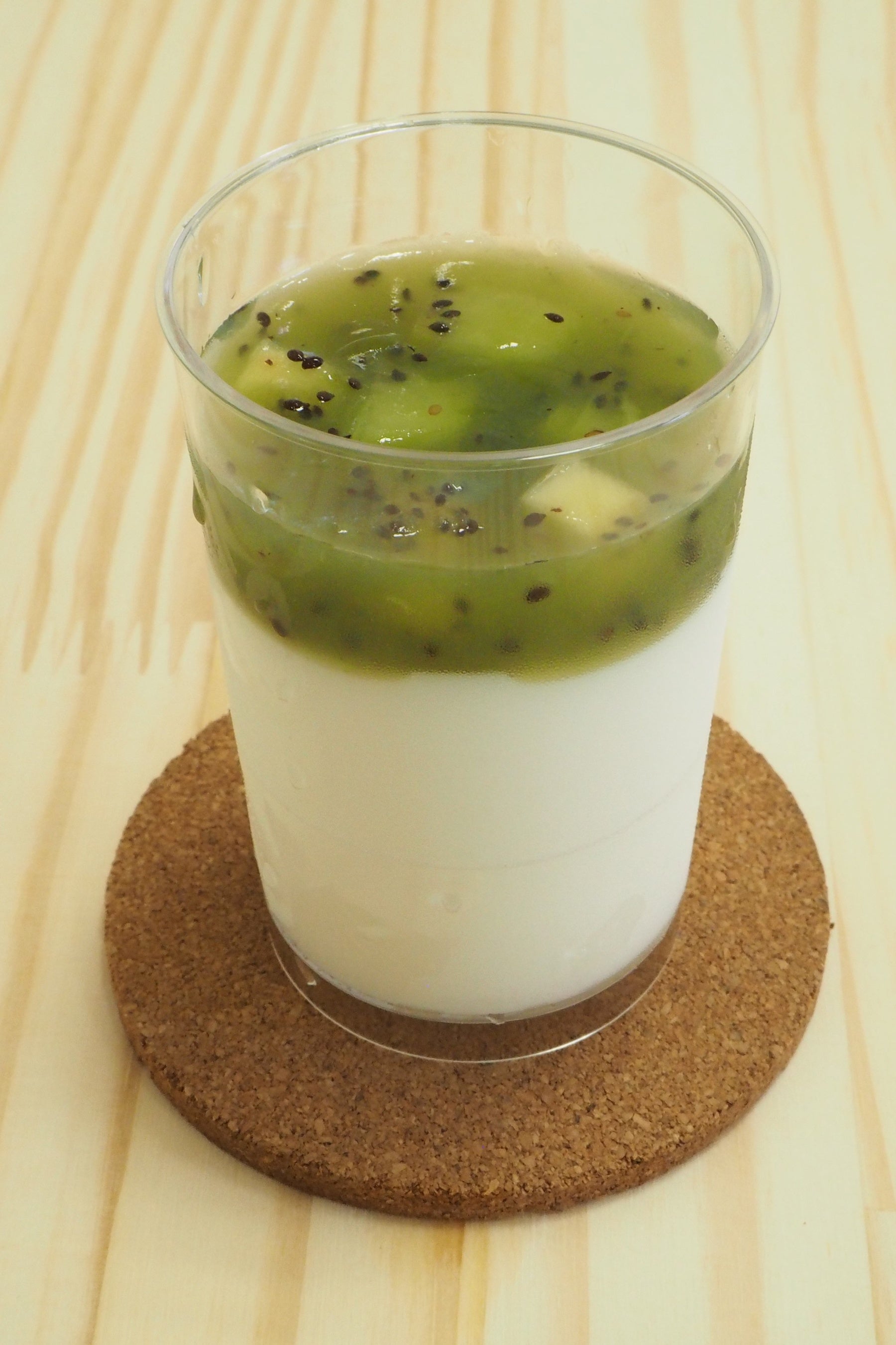 もっちりとした食感が特徴の「もちり」から、さっぱりジューシーなキウイ味が登場。下層は発酵させた小麦澱粉を杏仁、牛乳、生クリームで練りあげ、杏仁もちりに仕上げました。その上にフレッシュなキウイを贅沢に使用したキウイピューレを上掛けしました。杏仁もちりのなめらかさとキウイの甘酸っぱさが相性抜群です。そして、特徴的なもっちり食感の秘密はくず餅の原料である小麦澱粉。そんな新食感スイーツをこの機会にぜひお試しください。