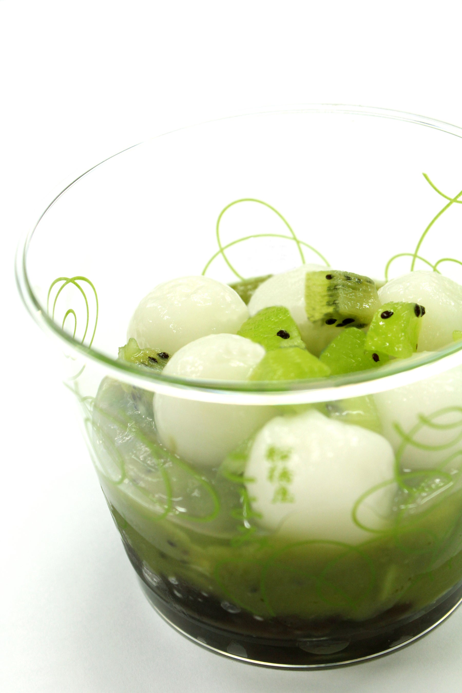 船橋屋特製の小豆とキウイ餡の二層になった船橋屋こよみオリジナルのおしるこです。隠し味に抹茶を入れることで、フルーツの酸味をまろやかに抑えコク味を出しました。角切りのキウイをトッピングして、濃厚かつ爽やかなお味に仕上げております。口いっぱいに広がるキウイの風味を存分にお楽しみください。