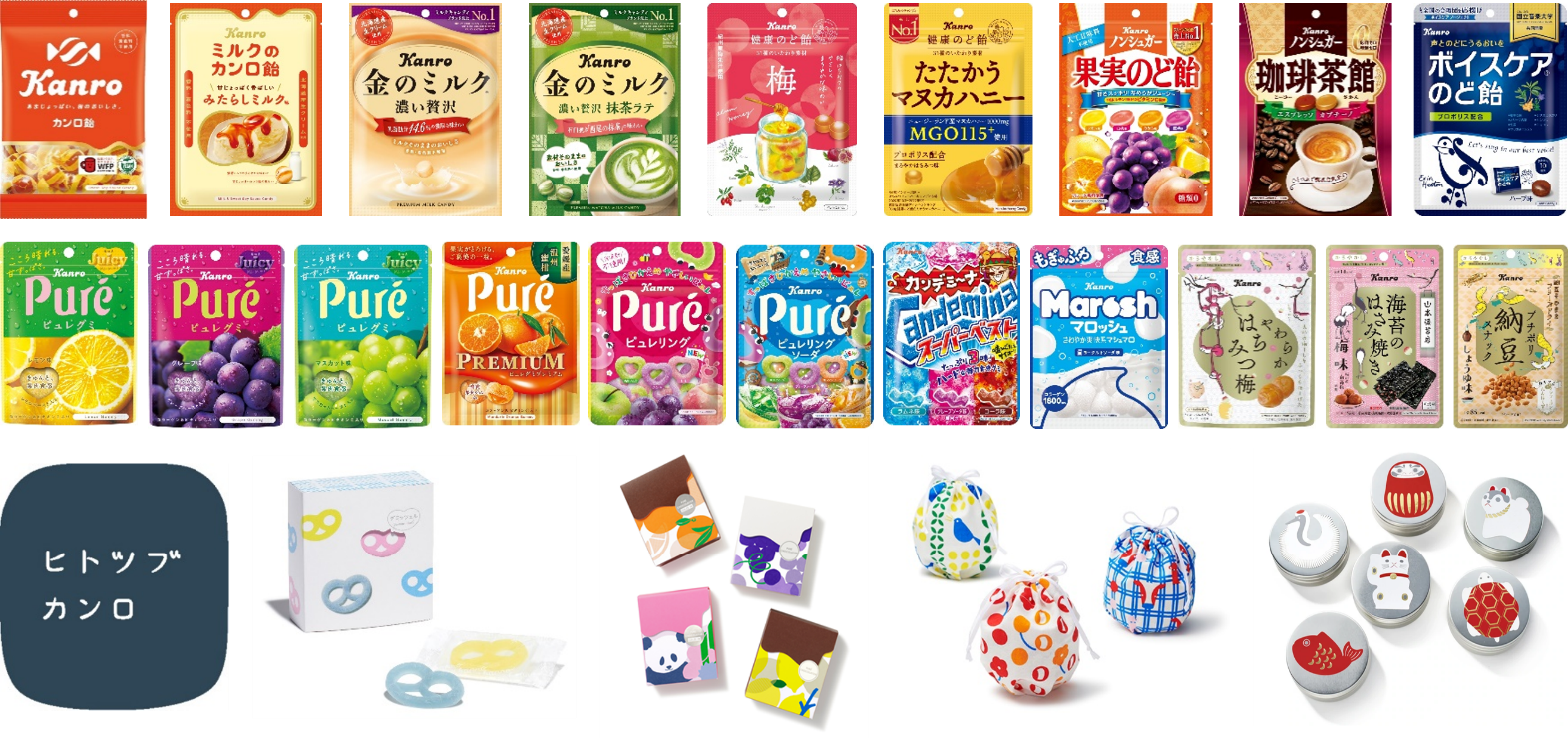 当社は1912年の創業以来、社名になっている「カンロ飴」を始め、菓子食品業界で初ののど飴となる「健康のど飴」、ミルクフレーバーキャンディ市場売上No.1ブランド※1「金のミルク」、大人向けグミの先駆けでありグミの売上トップブランド※2である「ピュレグミ」など、生活者の皆さまから愛される商品を創り続け、成長してまいりました。直営店「ヒトツブカンロ」では、「ヒトからヒトへ つながる ヒトツブ」をコンセプトにキャンディの魅力を発信しております。