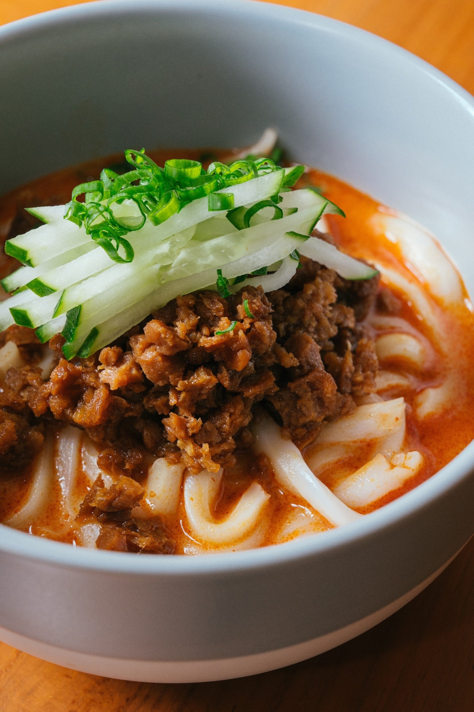 食物繊維を含むプラントベースミートとうどんで腹持ちの良いメニューです。