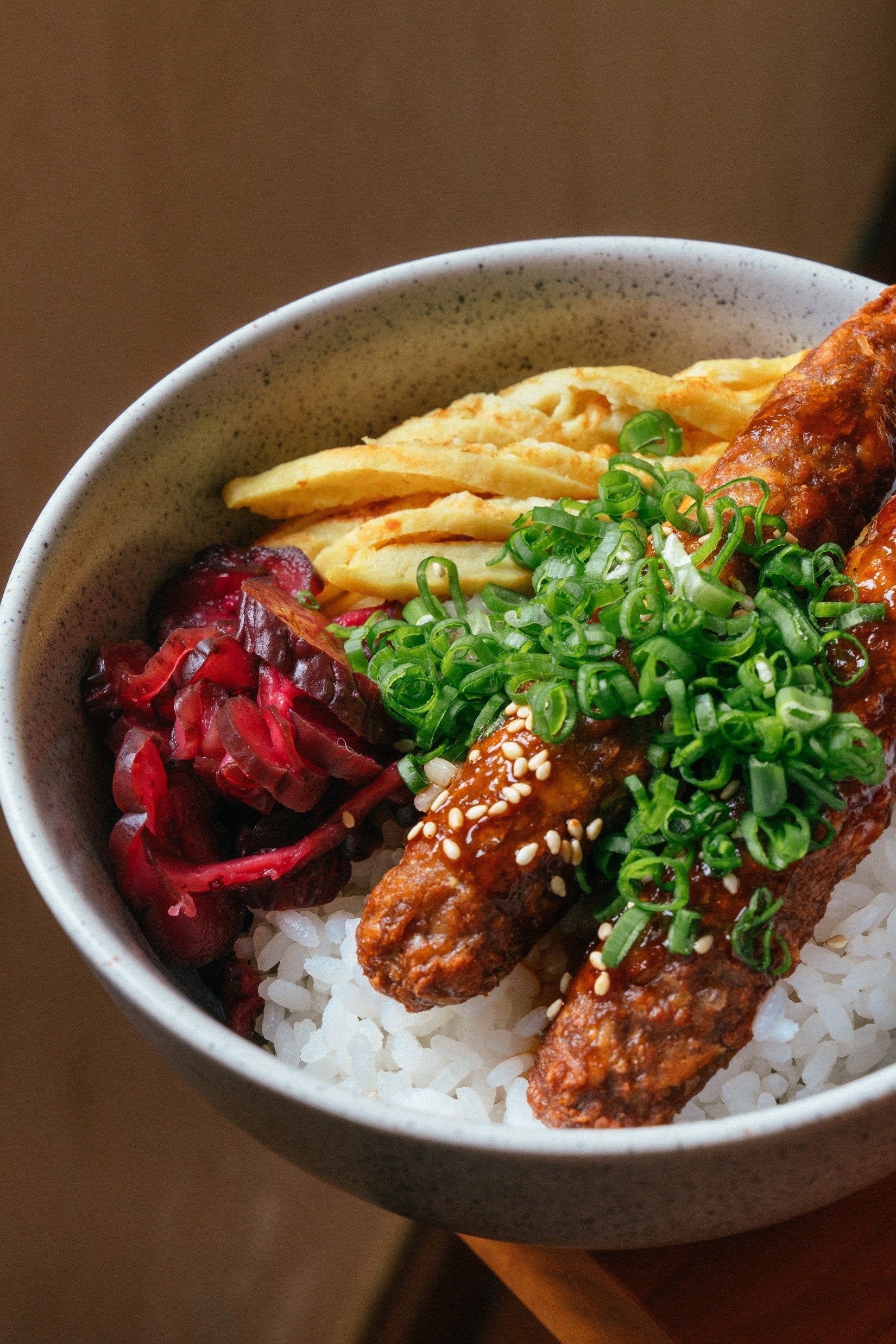 NIKUVEGE原木と生そぼろで作ったつくねを串に刺して炭火焼きにし、タレを絡めて丼の上に乗せた丼メニュー。