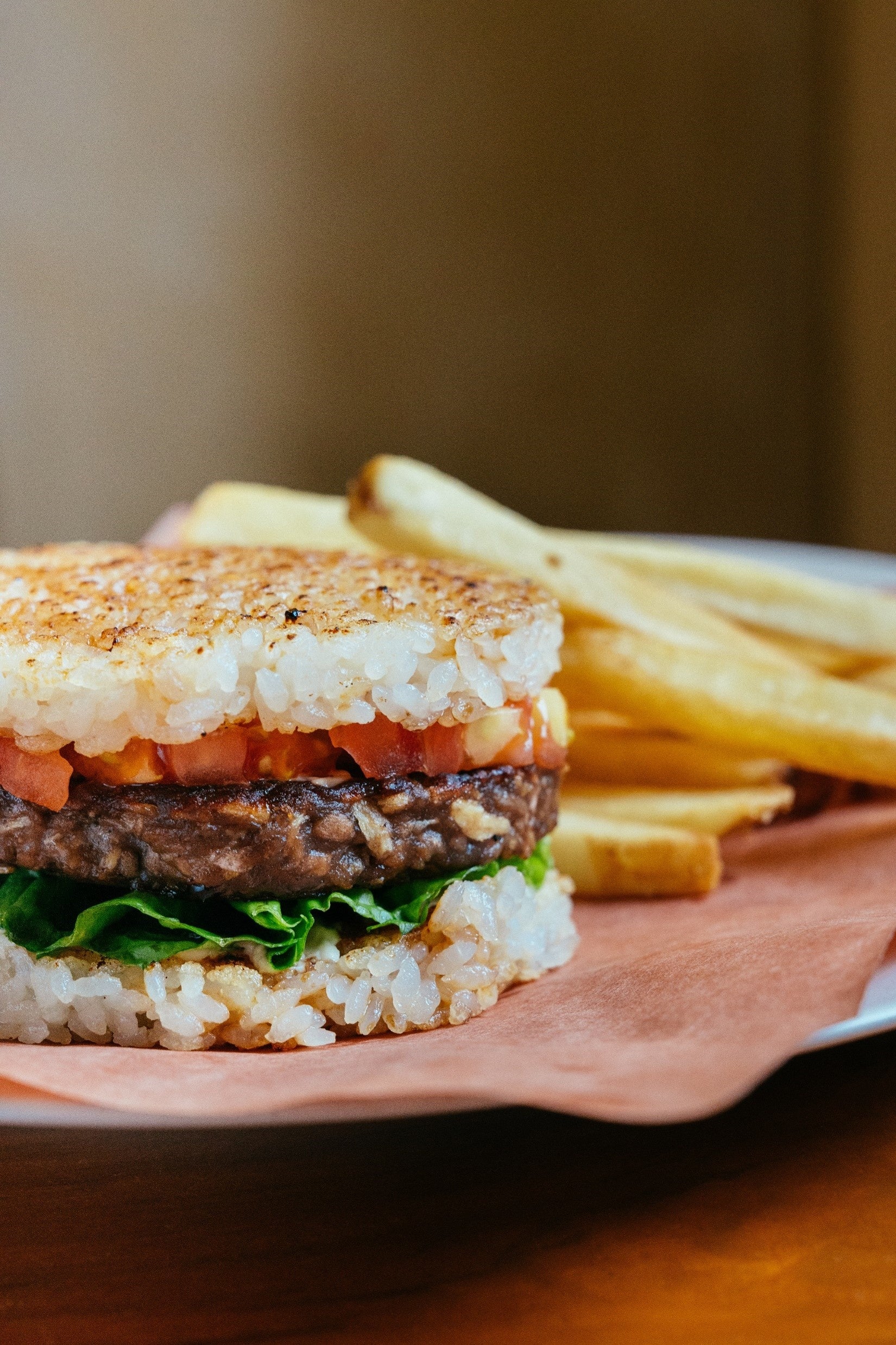 NIKUVEG生そぼろを混ぜ込んで醤油をつけて香ばしく焼いたライスのバンズに、NIKUVEGE原木と生そぼろで作ったパティをサンド。