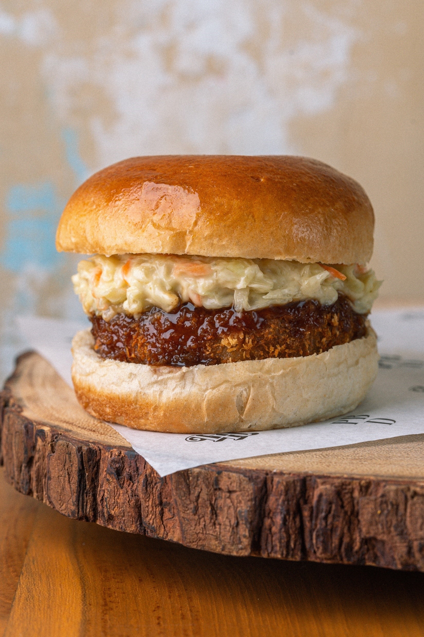 NIKUVEGEシリーズの中でも人気のNIKUVEGE豆乳クリームinハンバーグに衣を付けてカリカリに揚げ、バンズでサンドしてハンバーガーに仕立てました。