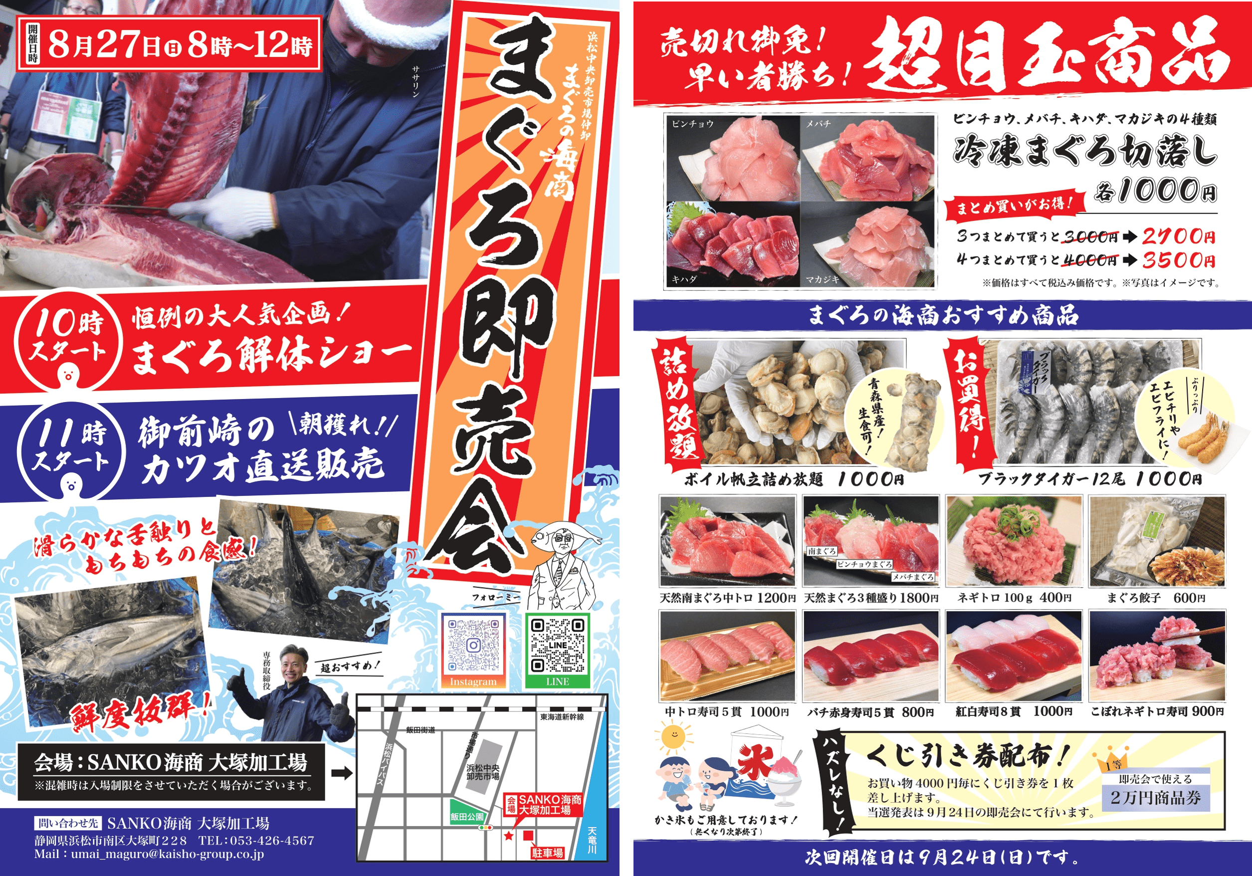 SANKO海商のまぐろ即売会が、どんどん進化中!人気の本まぐろ解体ショーに、御前埼のカツオが港から直行します。8月は生食できる「青森県産ボイルホタテ詰め放題1,000円」が登場。スタッフ全員で、どんな企画が喜んでいただけるのか、毎月アイデアを出し合っていますので、ご要望などありましたら、お気軽にスタッフにお聞かせください。実現できるよう、スタッフ一丸で頑張ります!
