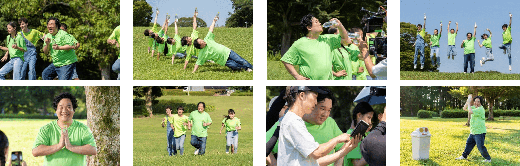 岡崎体育さんが出演するキャンペーンCM「い・ろ・は・す みんなでつくる い・ろ・は・すの歌篇」(15秒、30秒)を8月28日(月)より全国放映します。CMは青空の下にキャストが集まり、「い・ろ・は・す」を空に向かって元気よく掲げるシーンから始まります。岡崎体育さんがキャンペーンソングを高らかに熱唱し、歌に合わせて楽しく踊りながらみんなで「い・ろ・は・す」をたたみます。楽しい音楽やダンスにつられて、思わずいっしょに「い・ろ・は・す」をたたみたくなるCMになっています。5月15日から放映しているCM「ごくごく自然に未来を変える水篇」に起用している阿部寛さん、浜辺美波さんも登場し、ボトルをたたみます。