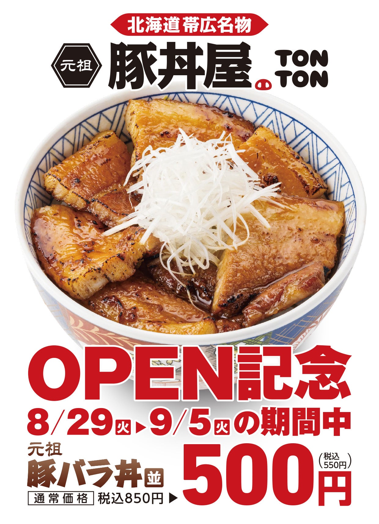 高知県庁前店のオープンを記念して、8/29(火)〜9/5(火)の期間中、当店自慢の「豚バラ丼〈並〉」を特別価格500円(税込550円)にて提供いたします。