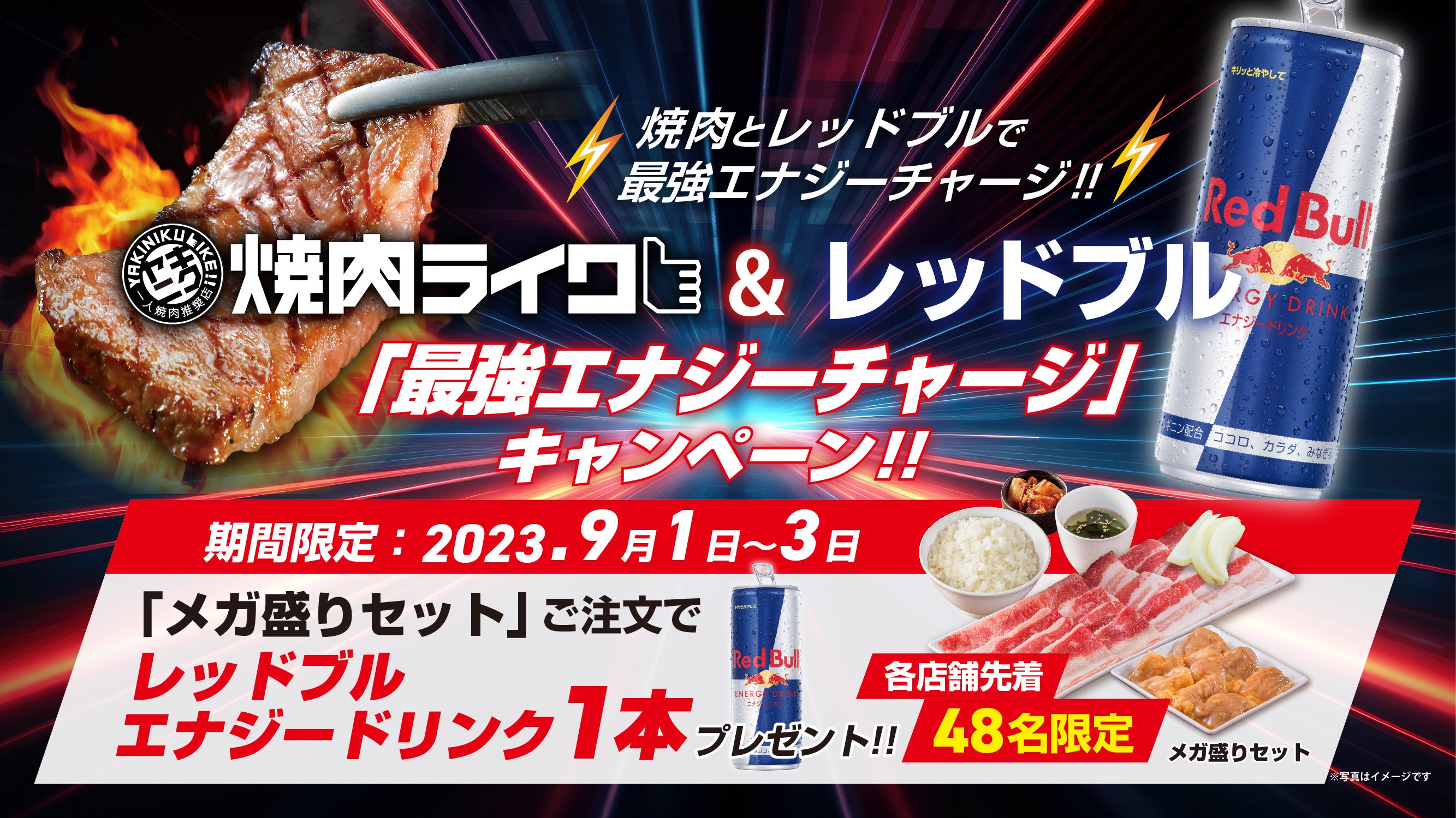 焼肉ライクの中でも最もボリューム満点のメニュー「メガ盛りセット」と「レッドブル」の最強コンビネーションでぜひエナジーチャージしてください。