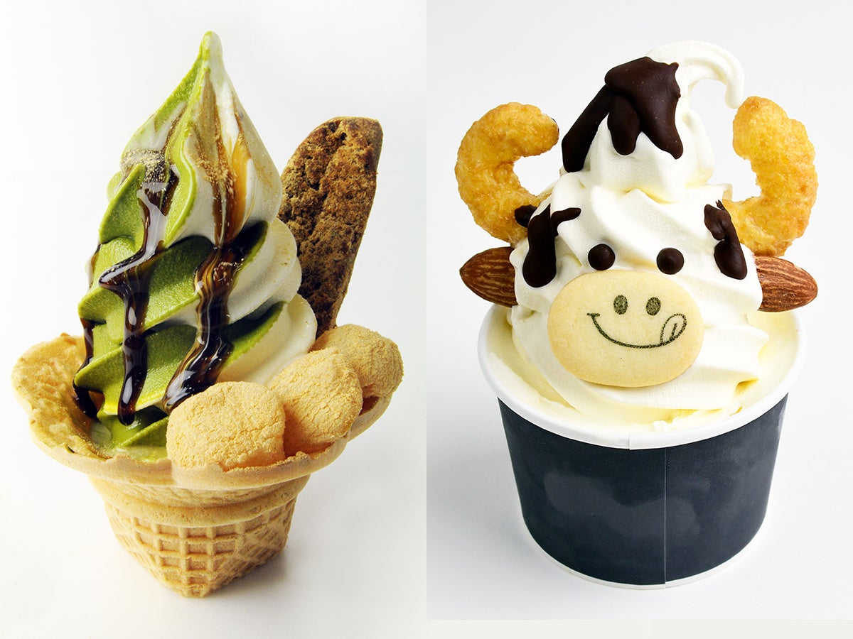 あいぱく人気商品!あいぱくアワード2016最高金賞受賞!2015年のイベントでの発売以来、不動の人気を誇るあいぱくの目玉商品!普段は山梨県以外ではなかなか食べられないソフトクリームです!香ばしいきな粉と濃厚なオリジナル黒蜜をたっぷり使った山梨銘菓の”桔梗信玄餅”とコクのあるソフトクリームが合体!さらに、黒蜜をしみこませたきなこ棒(桔梗信玄棒)をプラス。まるで専門店で食べる“和風パフェ”のようなリッチな味わいが特徴です。その場で自分流にトッピングできる『まきば牧場のウシさんソフト』も新登場!