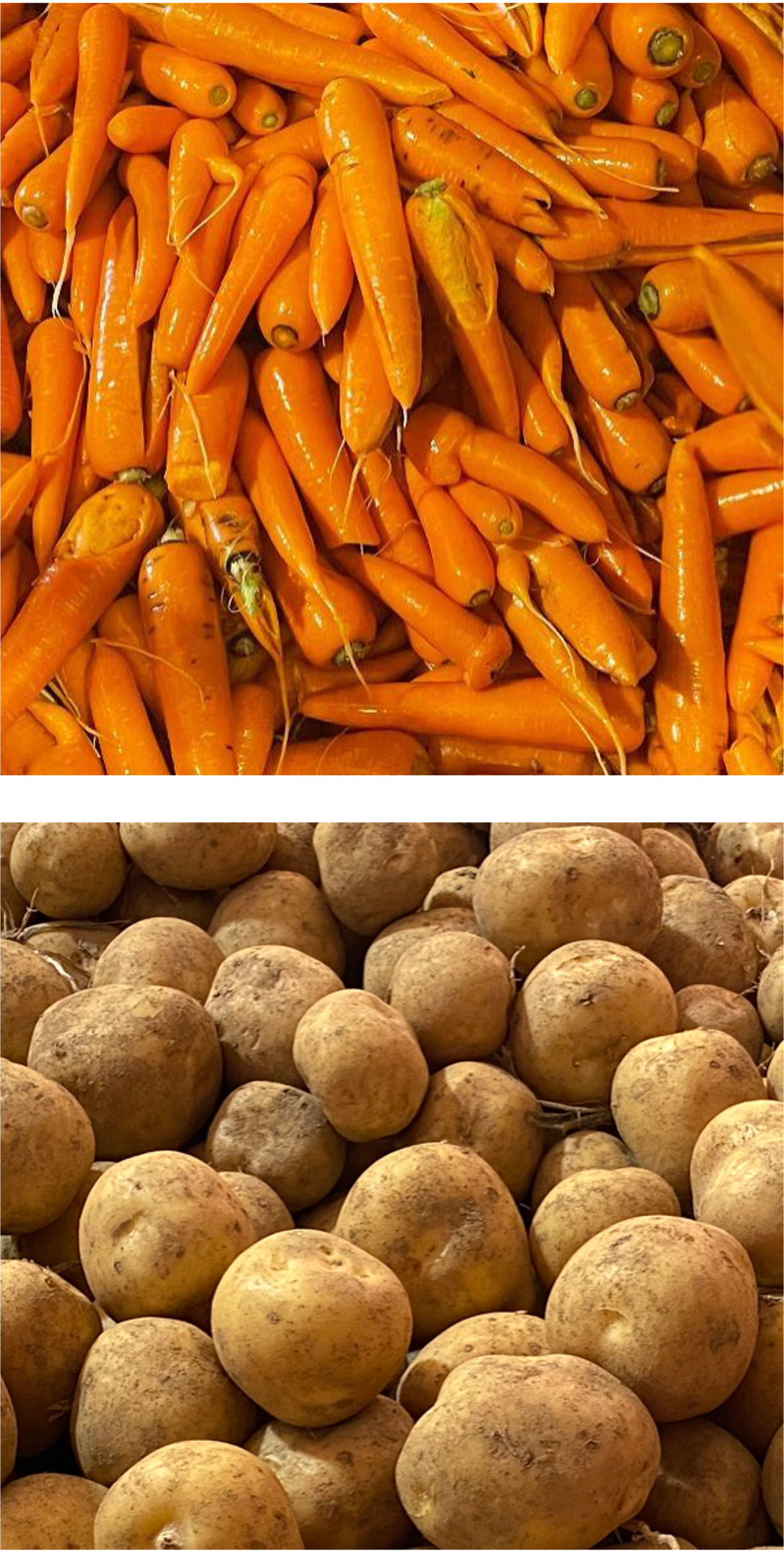 店舗では、規格外となってそのままでは廃棄されてしまう野菜がどのようななものか知っていただく機会になればと考えており、詰め放題でもご案内しないユニークな形の規格外のにんじん・じゃがいものディスプレイも行います。