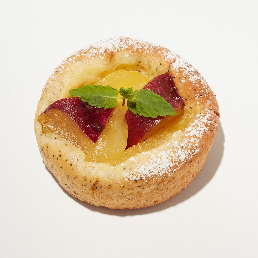 茶葉入りブリオッシュ生地にスイートポテトを絞り、りんごとさつまいもをのせ焼き上げました。
