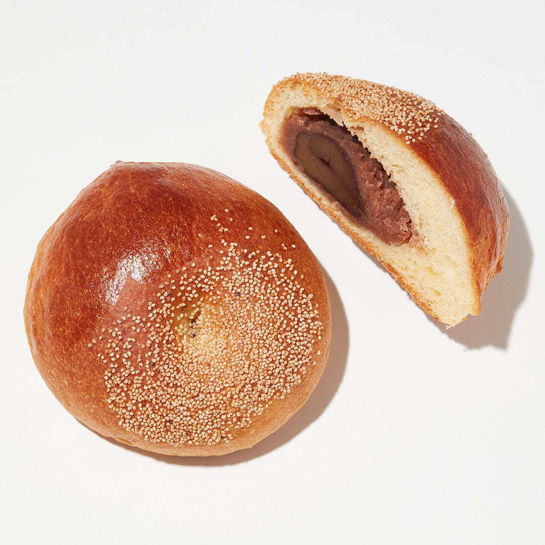 ブリオッシュ生地に香ばしい栗あんと渋皮煮の栗をまるごと包んで焼き上げました。