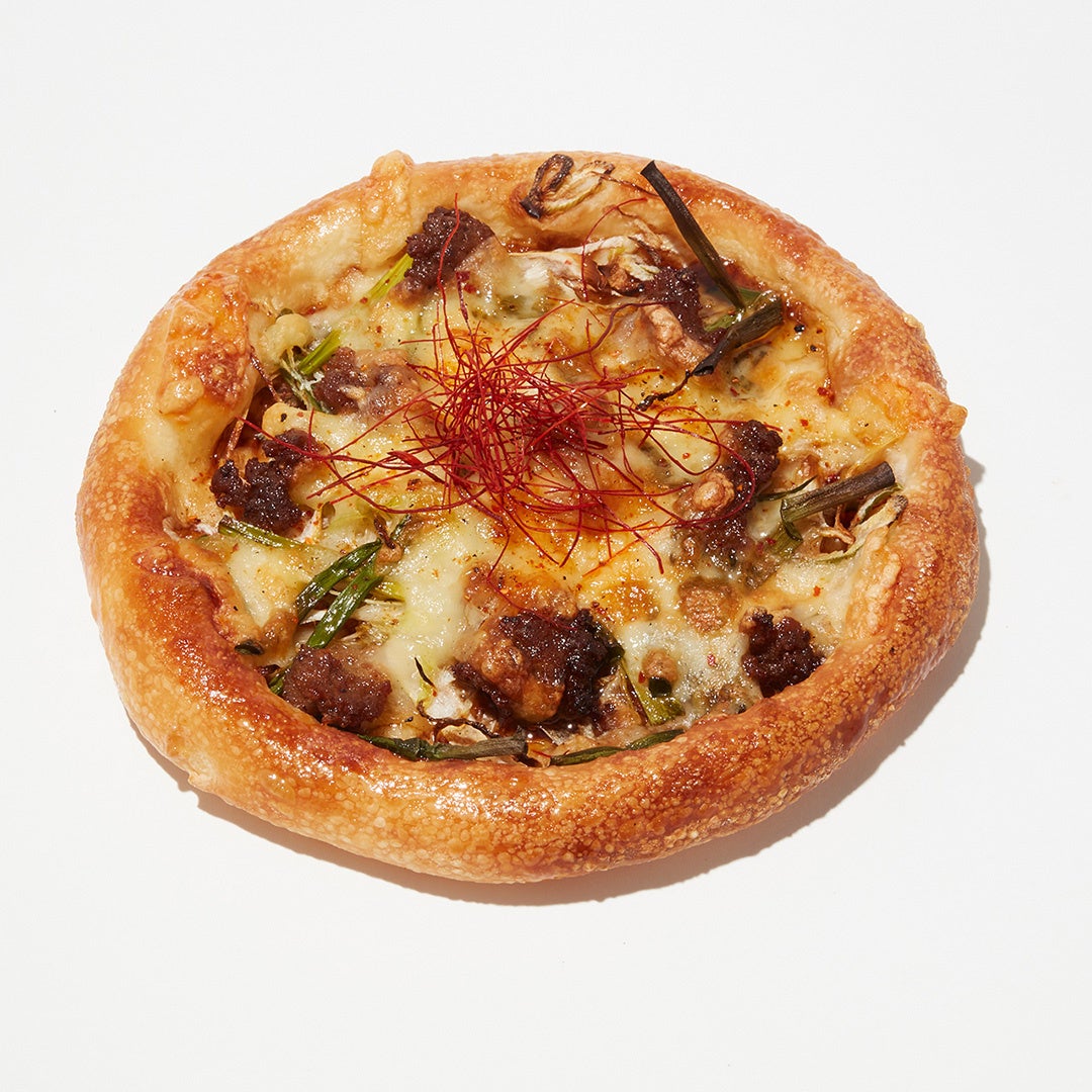オイスターソース、チキン、ネギをのせ、仕上げに一味唐辛子を使ったおつまみピザ風のフォカッチャ。