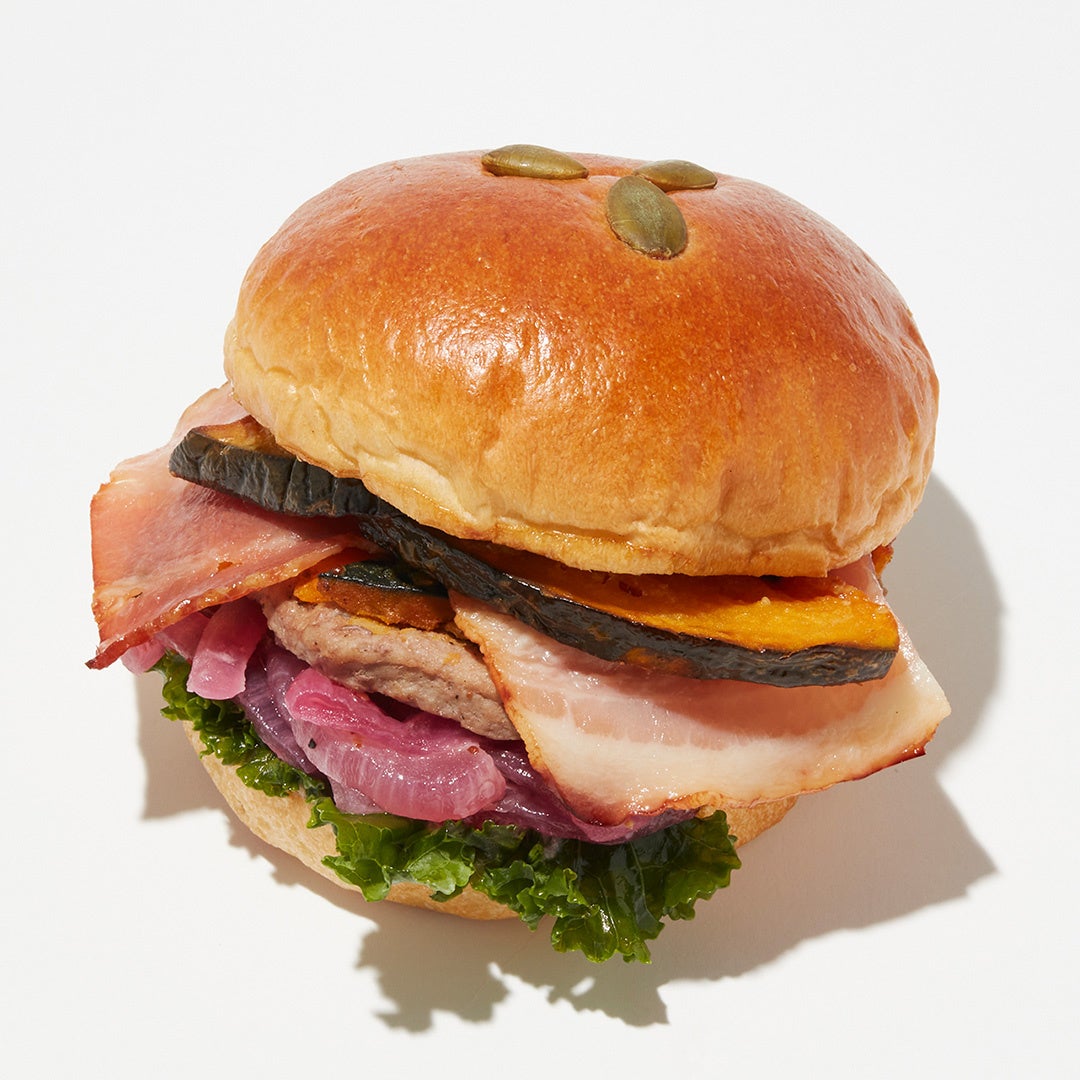 ビーフパティ・ベーコン・パンプキンサラダをサンド。スライスパンプキンをアクセントに。