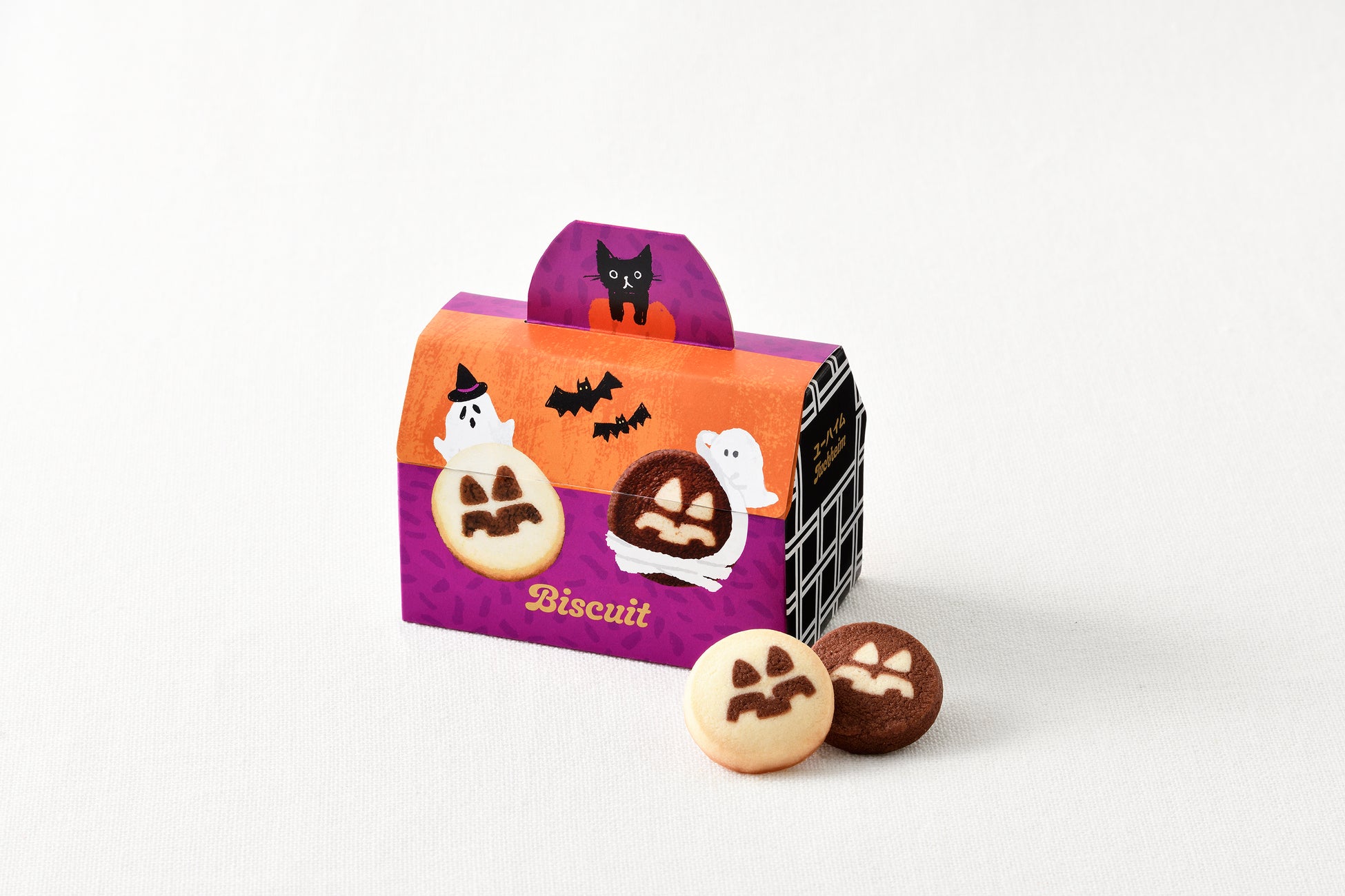 バターの風味を楽しめる生地と、ユーハイムオリジナルのチョコレートを使った生地を組み合わせた、お化けのシルエットのビスケット。ハウス型のパッケージ入り。