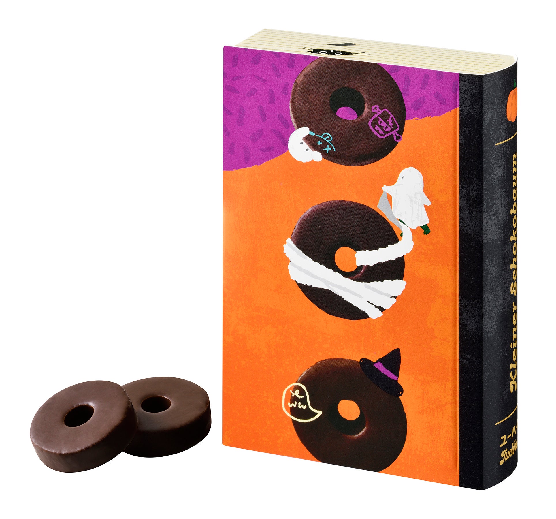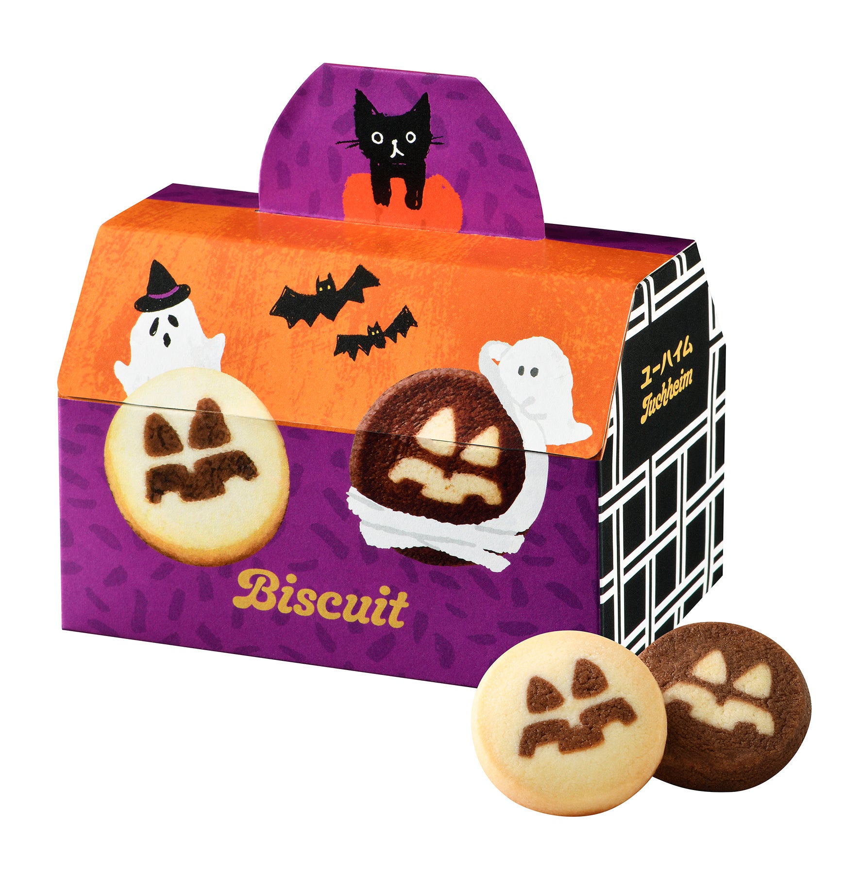バターの風味を楽しめる生地と、ユーハイムオリジナルのチョコレートを使った生地を組み合わせた、お化けのシルエットのビスケット。ハウス型のパッケージ入り。