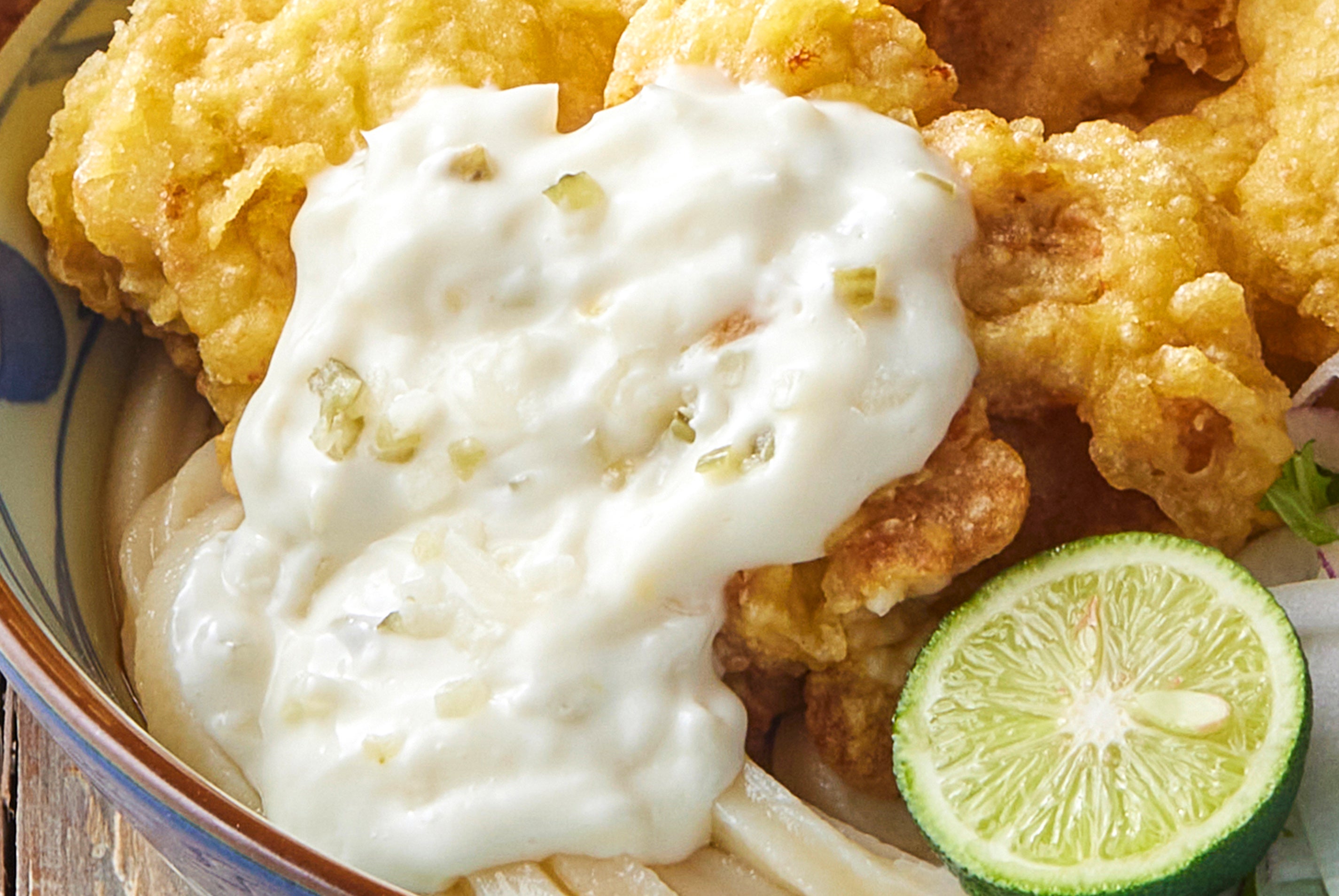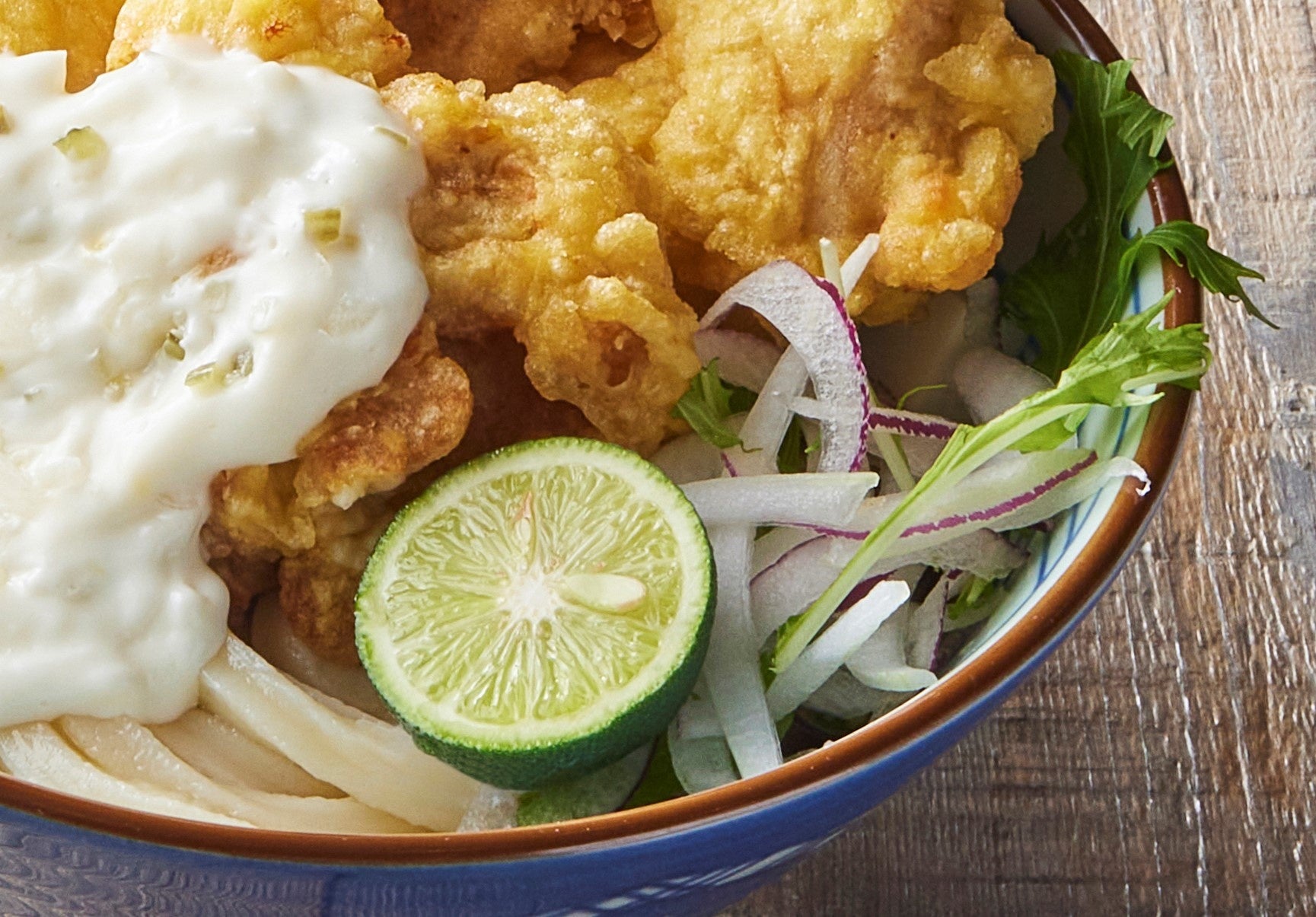 なめらかさアップ!打ち立てうどんと鶏天に絡む特製タルタルソース