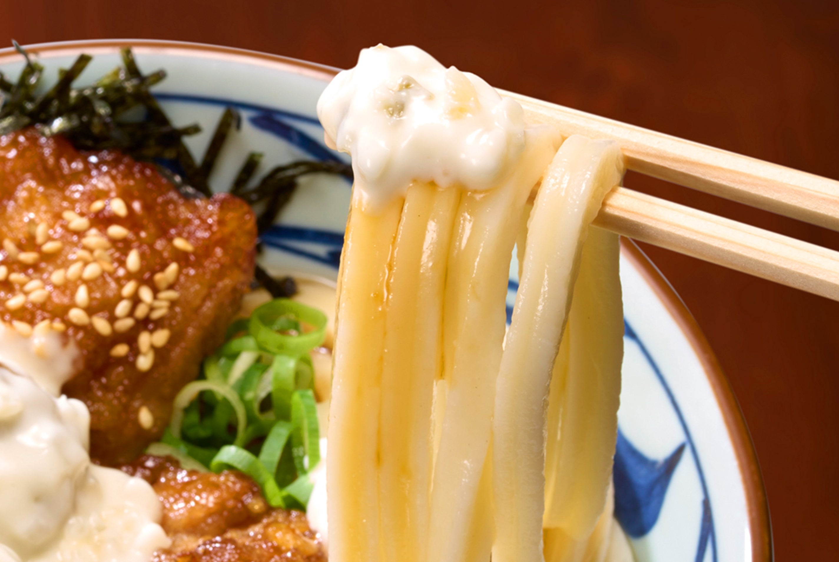 打ち立て、茹でたてのコシのある食感が、それぞれの具材とマッチ。しょうが風味のてりやきだれと、小麦香る打ち立てうどんの食べ合わせが新鮮です。特に冷たいうどんはのどごしが良く、つるつる、もちもちの“丸亀食感”をより感じていただけます。