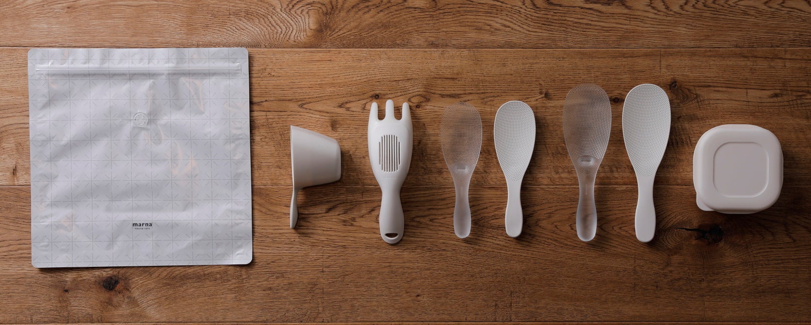 写真左より、極お米保存袋/極お米計量カップ/極お米とぎ/極しゃもじ小 2種/極しゃもじ 2種/極 冷凍ごはん容器