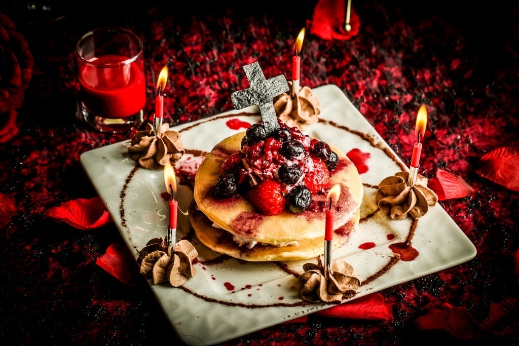 乾杯の後テーブルに運ばれてくる一枚の皿。そこには揺らめく蝋燭の灯に照らされ浮かび上がる魔法陣が!館の住人達とのコール&レスポンスで呪文を唱え、魔法陣にも“血”を注ぐ儀式を行えばそこに現れるのは…ふんわりと甘い薫りを放つパンケーキに、ミックスベリーがたっぷり乗った極上スイーツ。