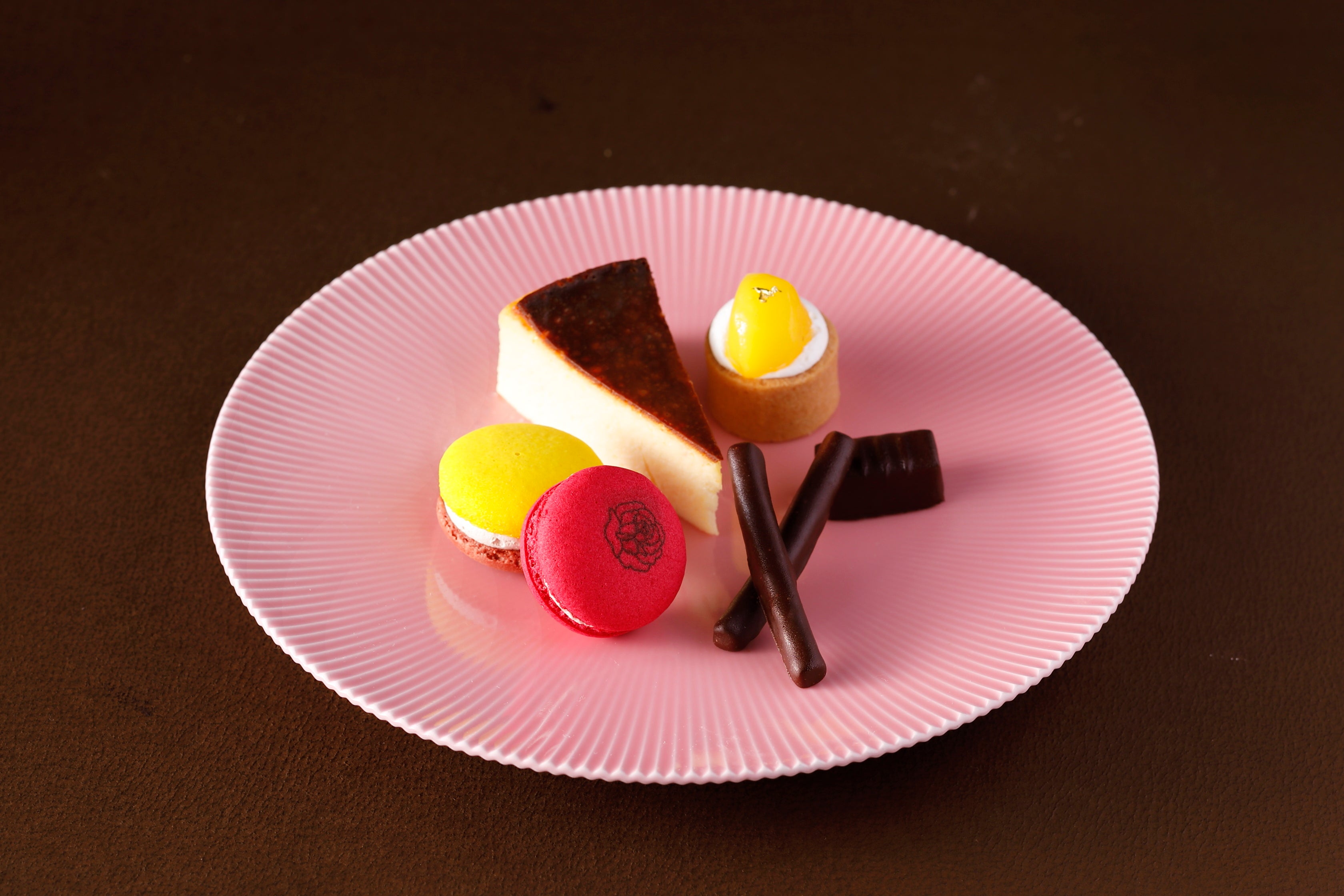 中段には、定番人気の軽いとろけるような口当たりの『バスクチーズケーキ』やシンプルながら栗の食感と風味が広がる『マロンタルト』、秋限定『マロンマカロン』や秋バラをイメージした『レッドローズマカロン』、濃厚な『ボンボンショコラ』など手軽にお愉しみいただけるスイーツが一皿に。
