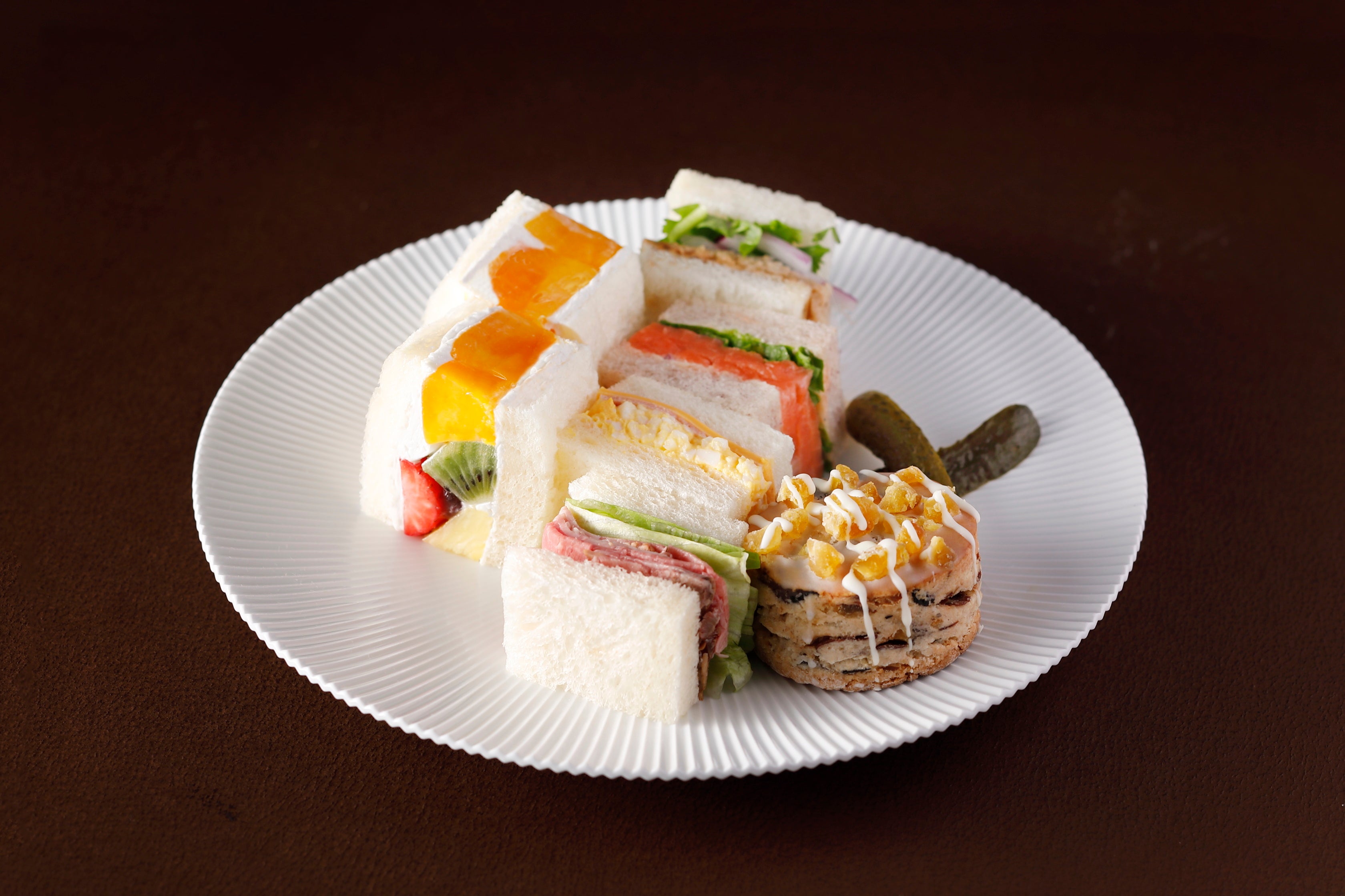 下段は、季節のフレッシュフルーツを詰め込んだ『季節の特製フルーツサンドウィッチ』のほか、バラエティに富んだ4種のサンドウィッチ、さらには丁寧に焼き上げられた紅茶との相性も抜群の『マロンスコーン』まで大満足のボリュームでご用意しました。