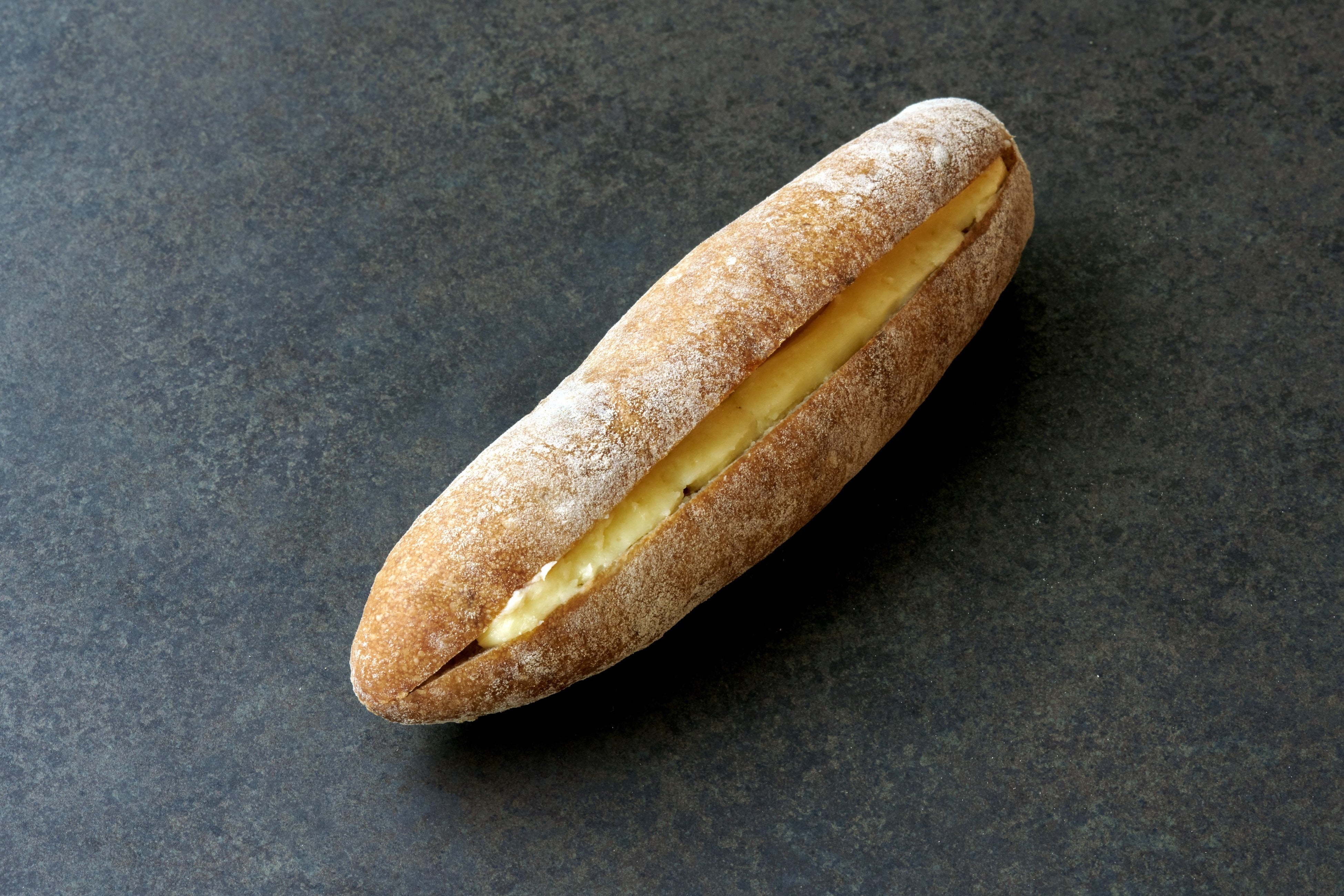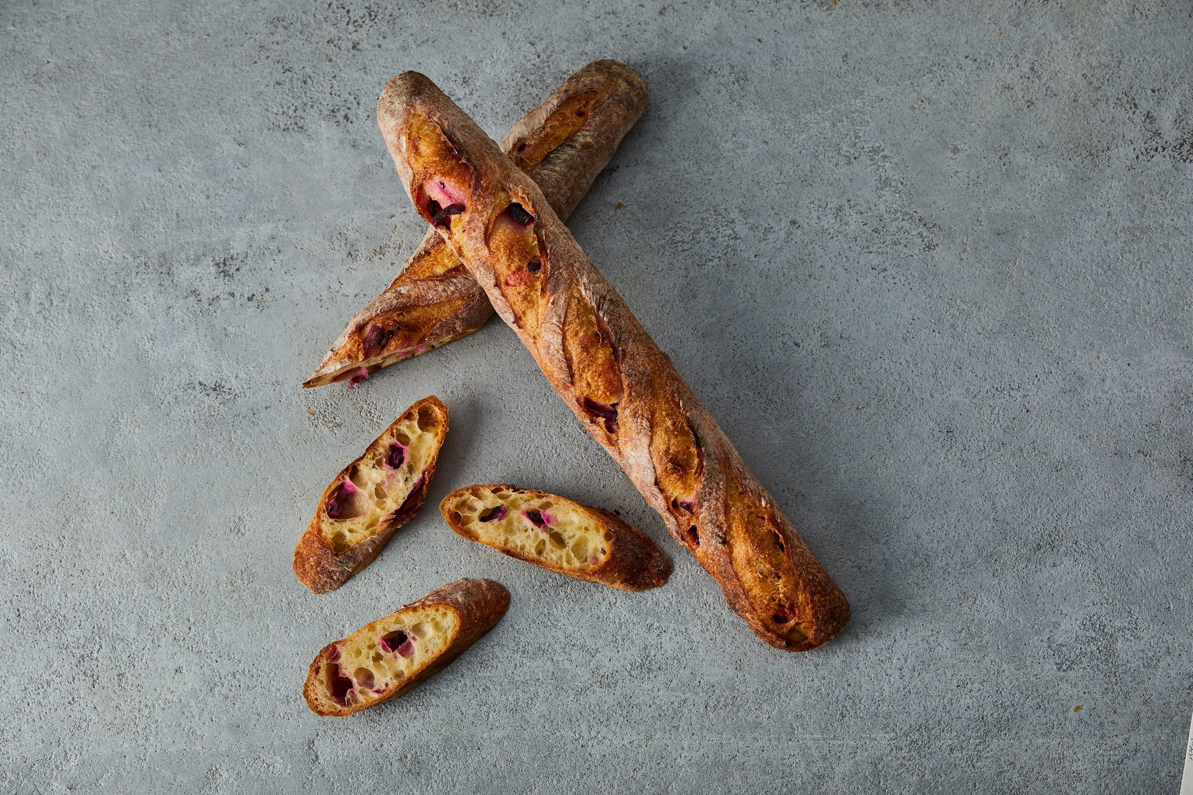 すぐき漬、千枚漬と並ぶ、「京都三大漬物」の一つ「柴漬け」。 その柴漬けを京都産小麦100%のバゲットに包み、青山椒をアクセントに入れ、柴漬けの酸味と赤しその鮮やかさ、鼻に抜けるすっきりとした青山椒の香りが爽やかなバゲットです。京都らしさを斬新な組み合わせで表現しました。