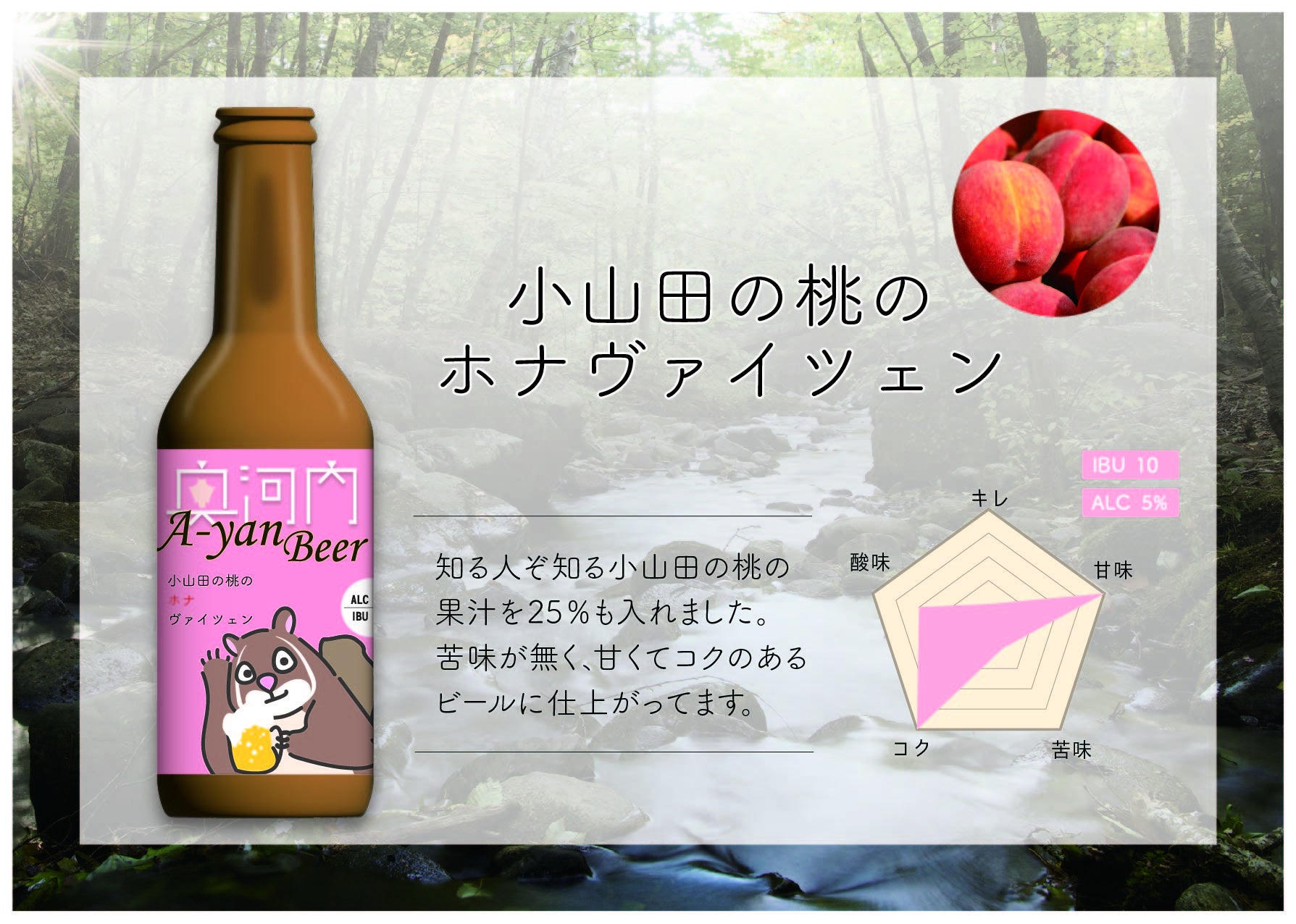 河内の風土が生み出した、香り高くジューシーな桃を、南ドイツ発祥の苦み控えめ、ヴァイツェンビールにしました。もぎたて新鮮な桃が25%入ることで、すっきり飲める仕上がりになっています。