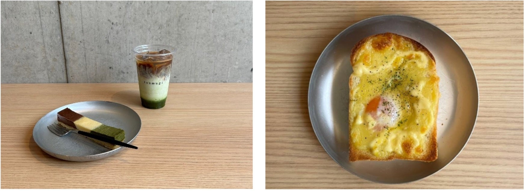 オープン以来の人気ドリンクとケーキ (左)、厚切りトーストなどの軽食はブランチにもおすすめ(右)