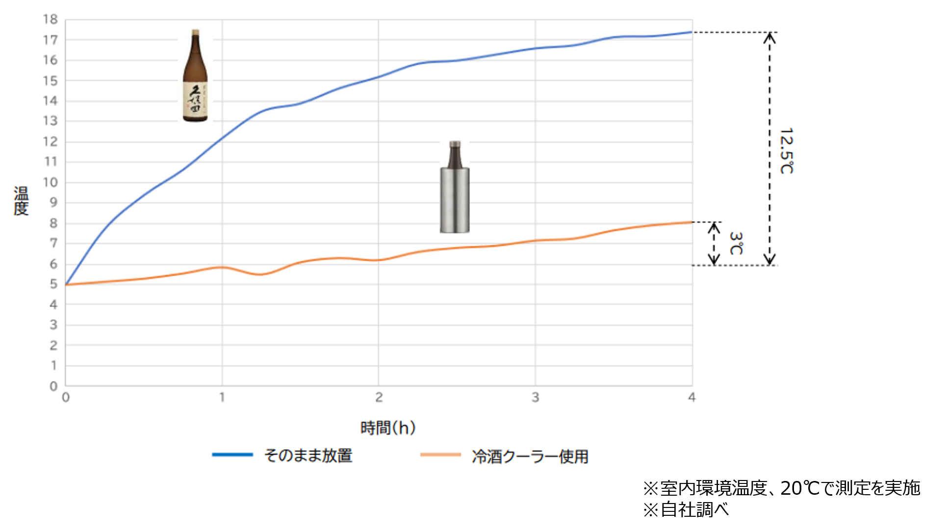 冷酒クーラーに入れておくだけで5時間置いても温度は3℃前後しか変化しません。温度にこだわりたい日本酒だからこそステンレス製真空二重構造の保冷力をお試しください。