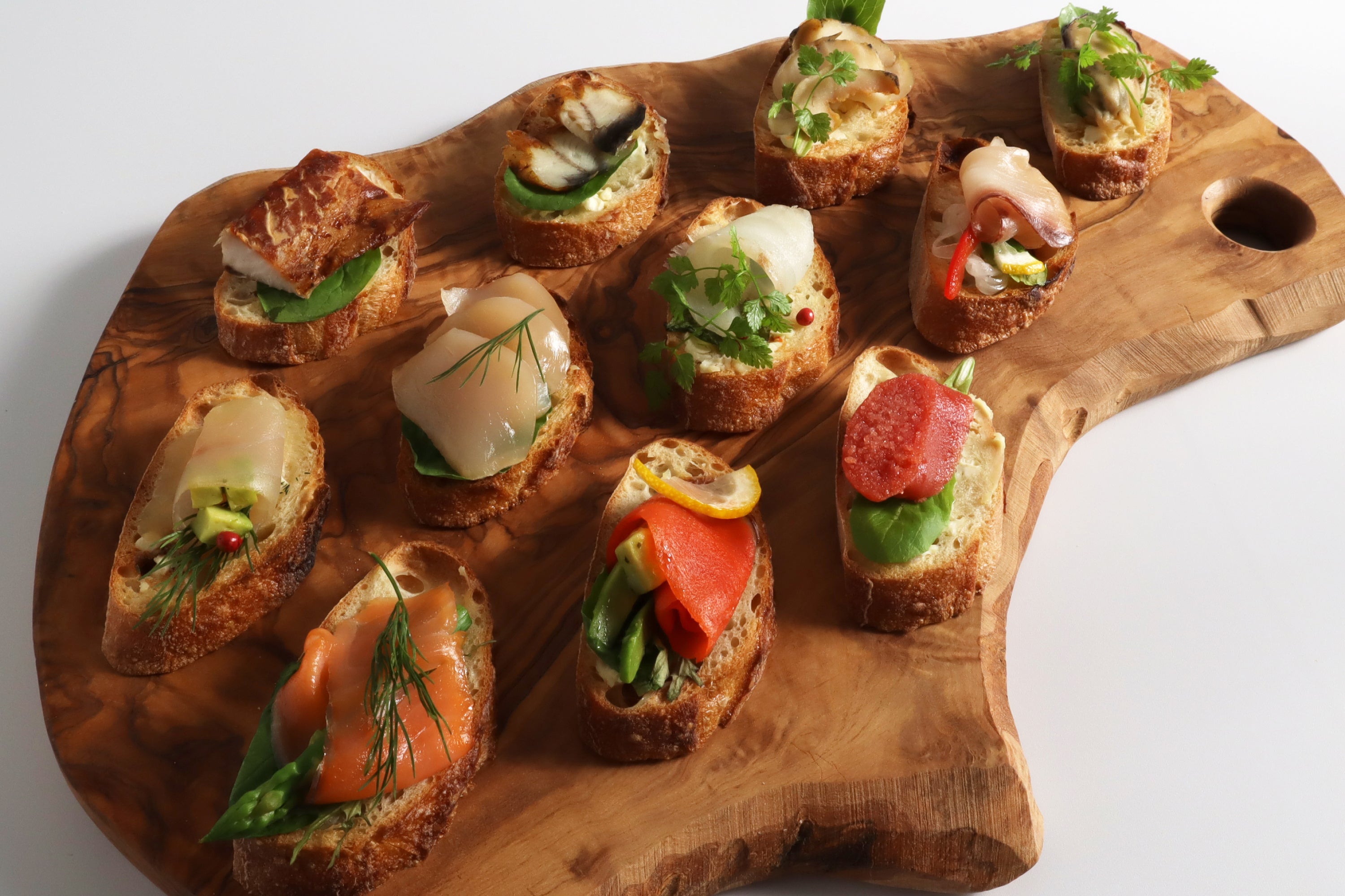 Kaoriの燻製品16種:紅鮭、キング、真鯛、かんぱち、帆立、カジキ、うなぎ、さば、真つぶ貝、明太子、ムール貝、天使の海老(冷燻製・温燻製)、スモークチーズ(プレーン・山椒味・七味唐辛子味)