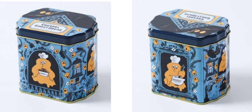 どこから見ても可愛いデザイン缶には、年に1度のハロウィンに向けて、キャラメルゴーストハウスでお菓子作りにいそしむオバケが描かれています!是非この機会にお求めくださいませ。