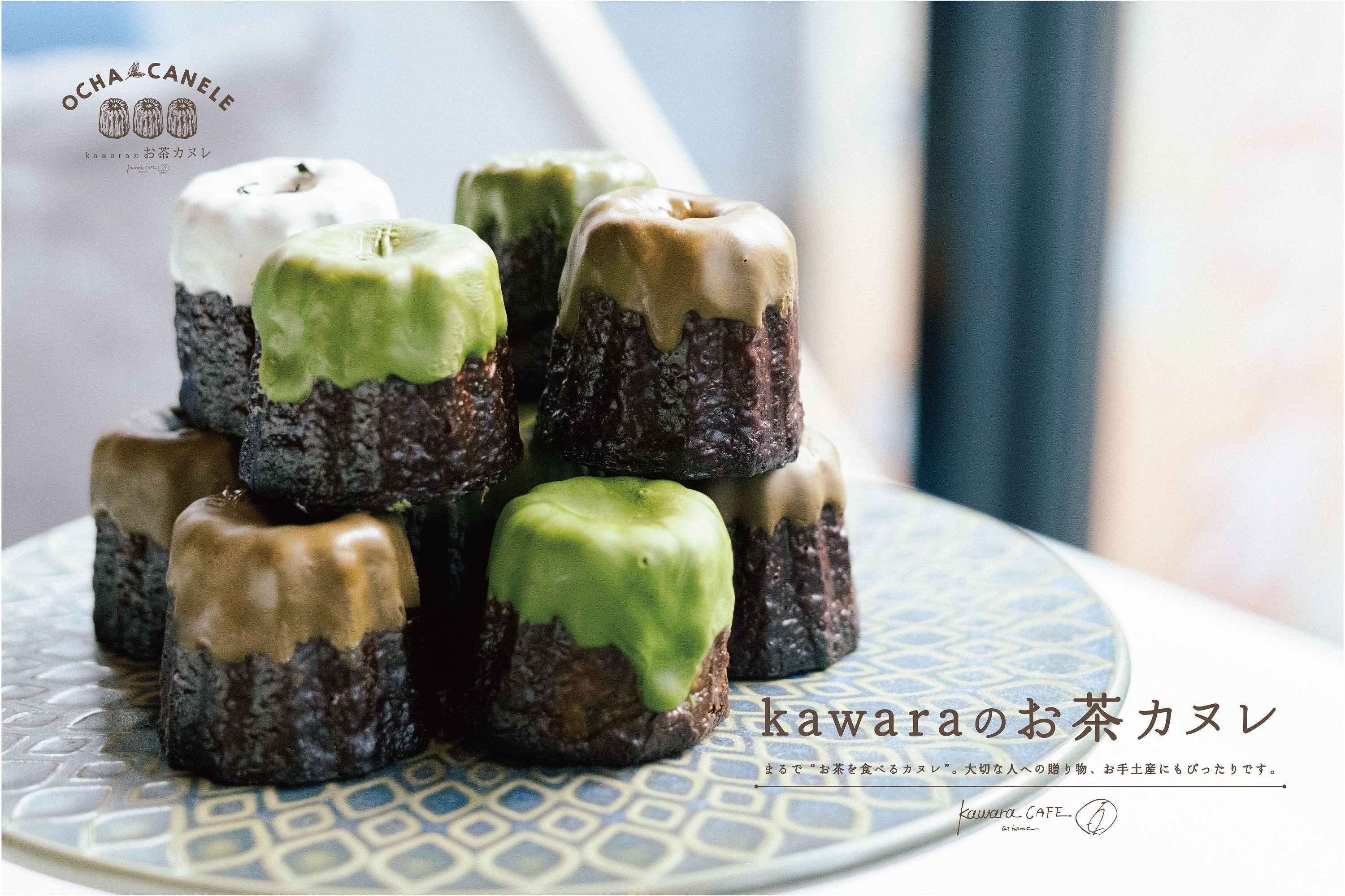 「kawaraのお茶カヌレ」は、”kawara CAFE”ブランドの公式ネットショップ「kawara CAFE at Home」にて販売中のお取り寄せスイーツ。「“お茶を食べる”カヌレ」をコンセプトとして、素材も国産茶葉にこだわり、パティシエがひとつひとつ丁寧に仕上げたスイーツです。