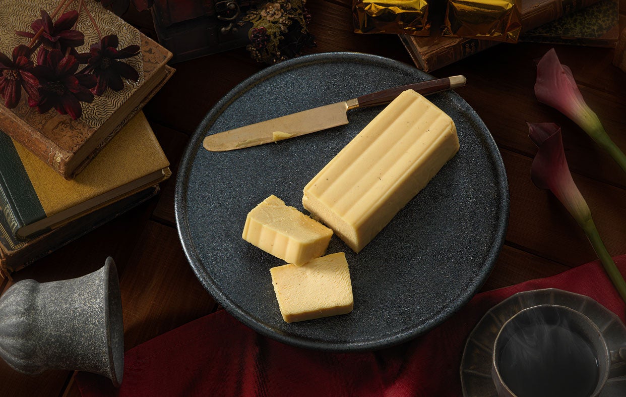クリームチーズとカマンベールチーズ。 一見相反する2つの異なる味わいをまとめるために試行錯誤した結果 あるひとつの食材にたどり着きました。 兵庫県にある共進牧場様の「ジャージー乳」は濃厚でコク深く、異なるチーズの風味をまろやかにまとめながら、かつお互いを引き立たせる最高のめぐり合わせでした。 口溶けに極限までこだわっているため、ナイフで切ると形が崩れてしまうほど柔らかく繊細なテリーヌ。 くるっと糸で巻いて切ることで簡単に美しい断面にすることが出来ます。