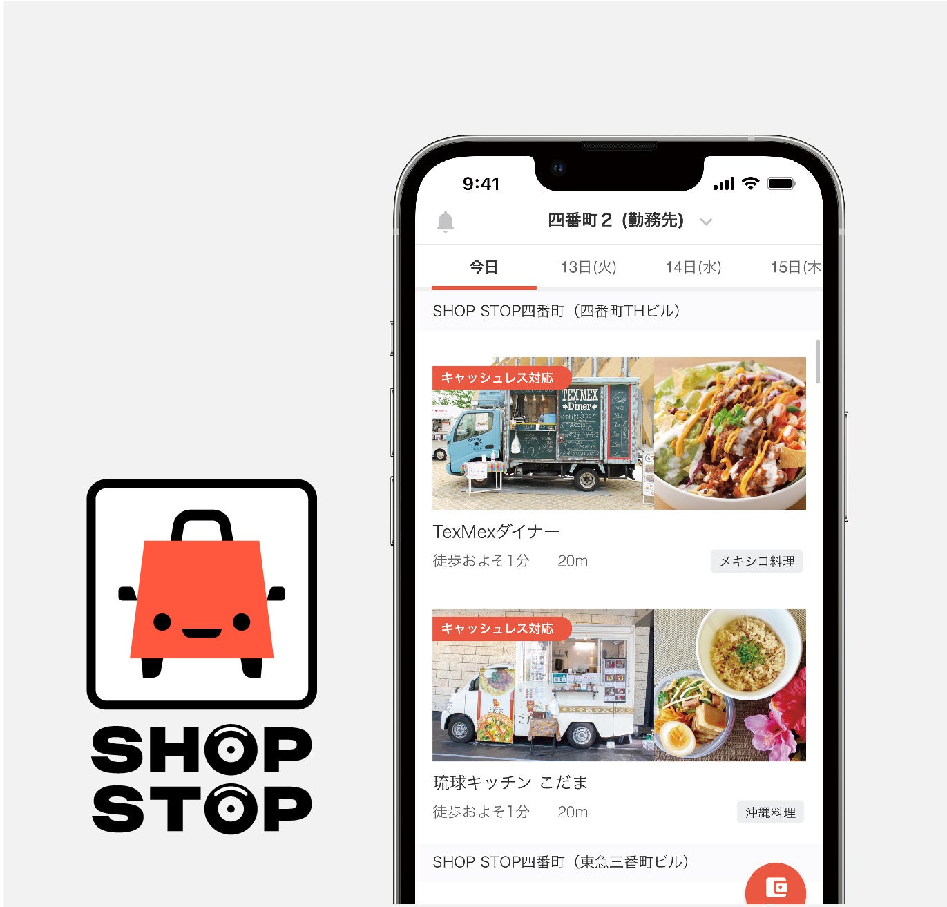 キッチンカーをはじめとした店舗型モビリティビジネス向けのプ ラットフォームです。現在、営業場所1100カ所以上、登録店舗数2700店以上と日本最大規模となっており、全国20都道府県で営業を実施済み(実証実験含む)で、今後もエリア拡大を加速していきます。また、多種多様なキッチンカーを手軽に探すことができるSHOP STOPアプリでは、個店の情報として分散しがちなキッチンカーの情報を集約し、集客機会や顧客接点を創出しています。また、ハイブリッドワークに適した「勤務地・自宅登録機能」や、「気になるお店の通知機能」も搭載するなど、キッチンカー事業者、顧客双方の課題の解決や、社会の変化に応じたアップデートを続けています。
