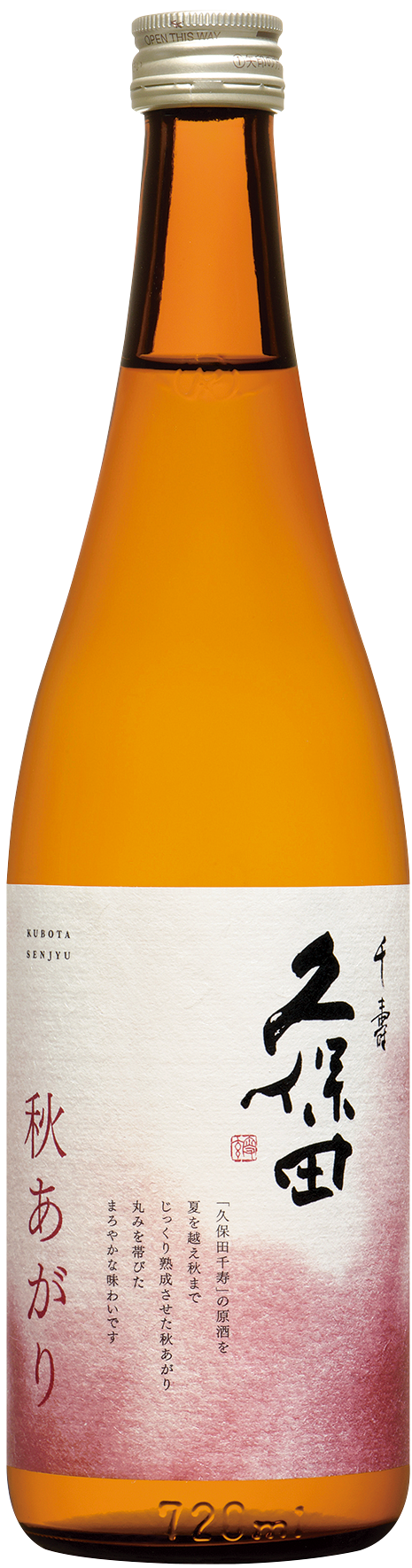 冬に仕込んだ『久保田 千寿』の原酒を、夏を越え秋までじっくり熟成させた秋あがり。搾りたての生原酒ならではの濃厚でしっかりとした味わいが、火入れ後の熟成によって、丸みを帯びたよりまろやかな味わいへと変化しています。冷やすと、千寿ならではのキレとやわらかな酸味を、常温でとろっとした口当たりと旨味をお楽しみいただけます。