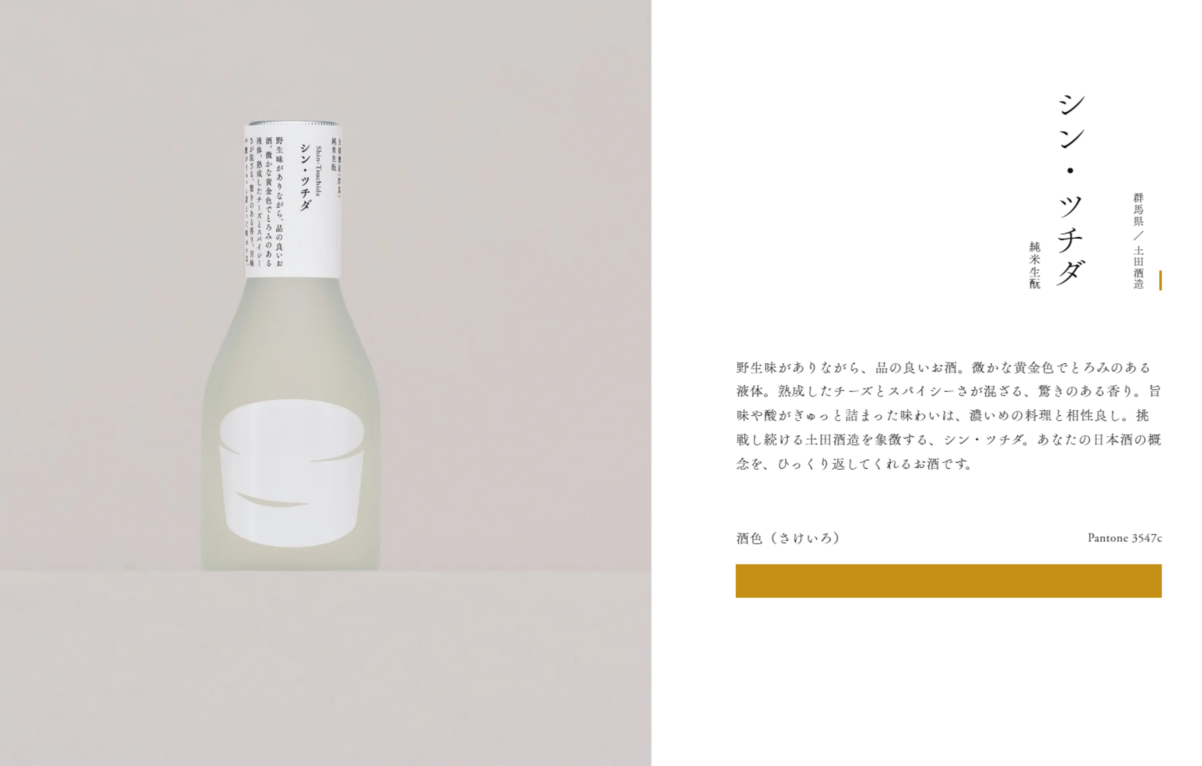 野生味がありながら、品の良いお酒。微かな黄金色でとろみのある液体。熟成したチーズとスパイシーさが混ざる、驚きのある香り。旨味や酸がぎゅっと詰まった味わいは、濃いめの料理と相性良し。挑戦し続ける土田酒造を象徴する、シン・ツチダ。あなたの日本酒の概念を、ひっくり返してくれるお酒です。