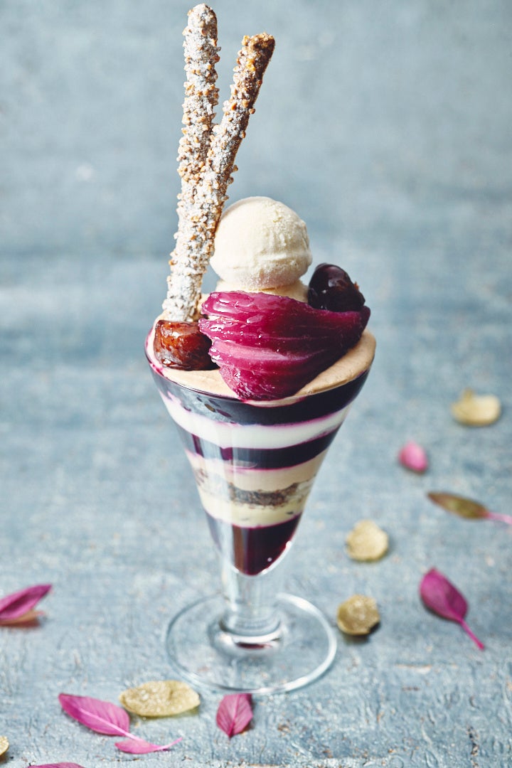 やさしく甘い栗とジューシーで香り高い洋梨の赤ワイン煮が贅沢で大人な味わいに。カシスブルーベリーの酸味やチョコレートのシャンティ―が絶妙なバランスで構成された、艶めきある仕上がりに。