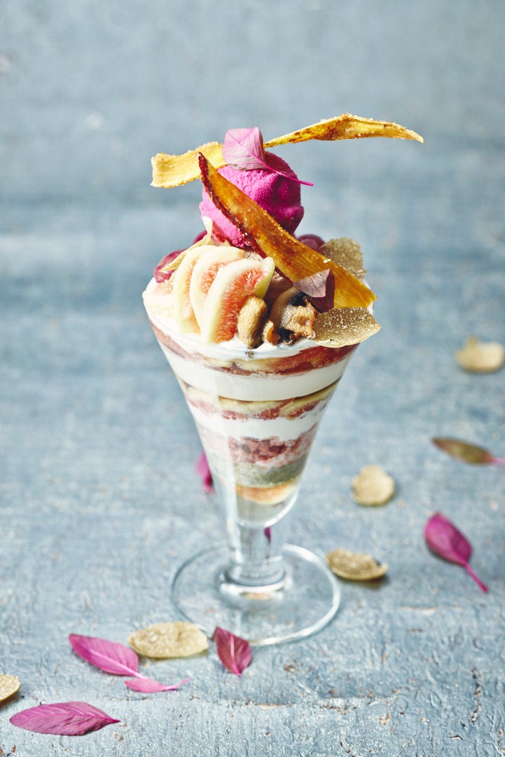 フレッシュいちじくを贅沢につかい、白ブドウジュレや巨峰のソルベが秋の味わいを豊かに重ねます。芳ばしいほうじ茶と、マッシュルームのクリーミーで甘い香りのアクセントがユニーク!