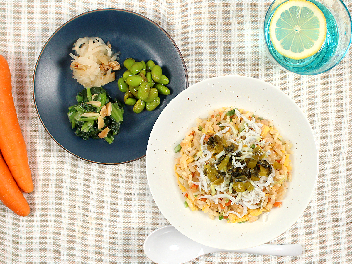 たまご、人参、ネギ、タケノコの具材をたっぷり入れることで糖質を抑えたナッシュオリジナルの炒飯に、香り高い高菜漬けとしらす干しをトッピングいたしました。よく混ぜてお召し上がりください。